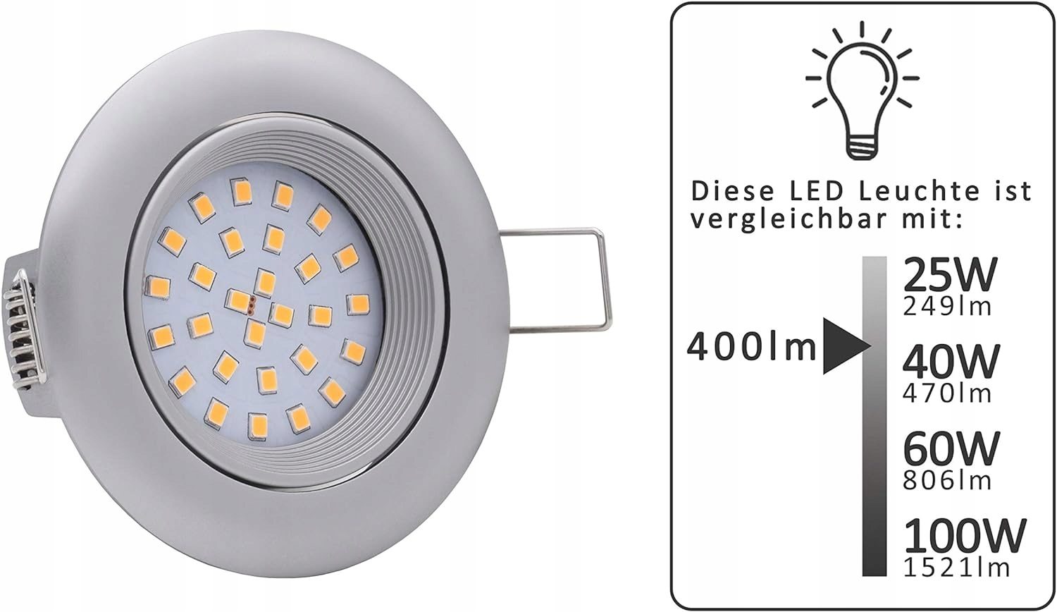 Высококачественный спот: Потолочный спот Lumare мощностью 4 Вт обеспечивает немерцающий приятный теплый свет при низком энергопотреблении. Благодаря степени защиты IP44 он также подходит для влажных помещений. Источник света в этом светодиодном точечном светильнике сменный. Это означает, что ее можно легко заменить, и вам не придется выбрасывать всю фару в маловероятном случае неисправности.
