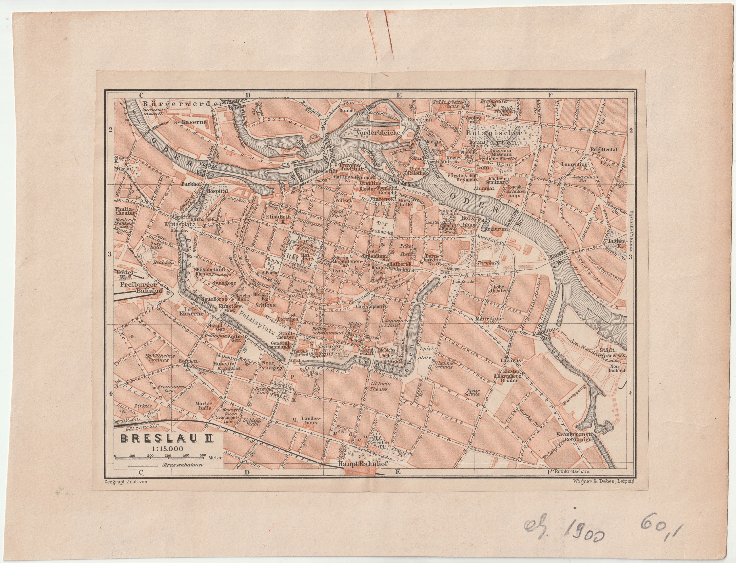 ВРОЦЛАВ. План города, издание: География. Анштальт фон Вагнер и Дебес, Лейпциг, около 1900 г., литография, масштаб 1:15 000; план, наклеенный на лист, представлявший собой фрагмент карты; на листе остался след от скрепки, не повреждающий план; размеры в плане: ок. 208х158 мм, габаритные размеры: ок. 270х205 мм.