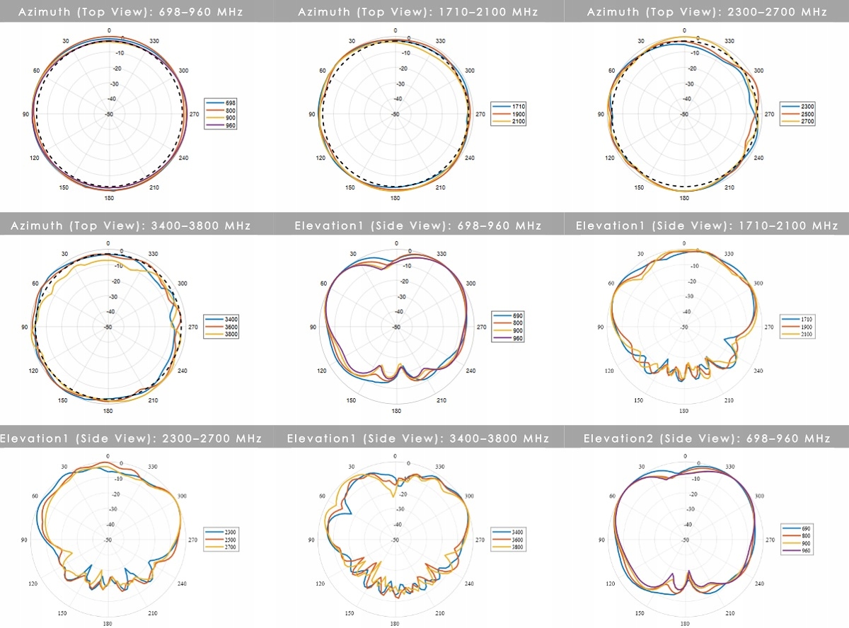 6dBi — пиковое усиление во всех диапазонах 698–960, 1710–2700 и 3400–3800 МГц