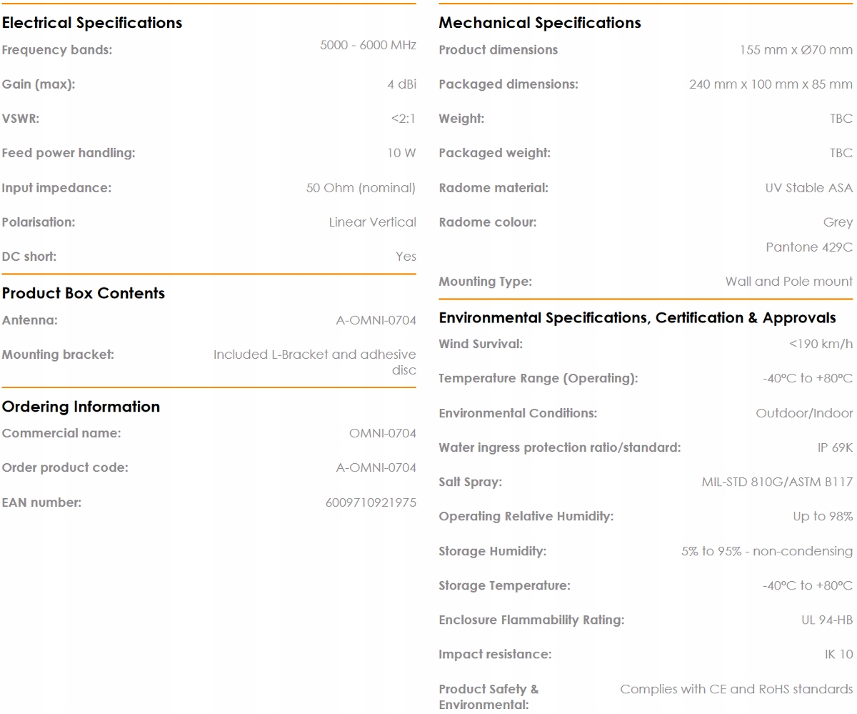 Антенна OMNI-704 входит в новую линейку антенн Rhyno. OMNI-704 работает в диапазоне 5,0–6,0 ГГц, охватывая диапазон Wi-Fi 5 ГГц, и имеет максимальное усиление 4 дБи. Антенна имеет постоянное усиление во всем рабочем диапазоне, поскольку это обеспечивает лучшую производительность при надежном соединении. Антенна спроектирована с отличным контролем диаграммы направленности по всей частоте покрытия, что делает OMNI-704 исключительной всенаправленной антенной для своего размера. Корпус антенны изготовлен из устойчивого к УФ-излучению материала ASA, который обеспечивает защиту в высококоррозионных средах, включая химические и токсичные среды, например, на промышленных предприятиях. Прочный корпус и конструкция обеспечивают защиту в неблагоприятных условиях окружающей среды на уровне IP 69К и IK 10. Антенна имеет в основании гнездовой разъем типа N, к которому можно подключить кабель нужного типа и длины.
