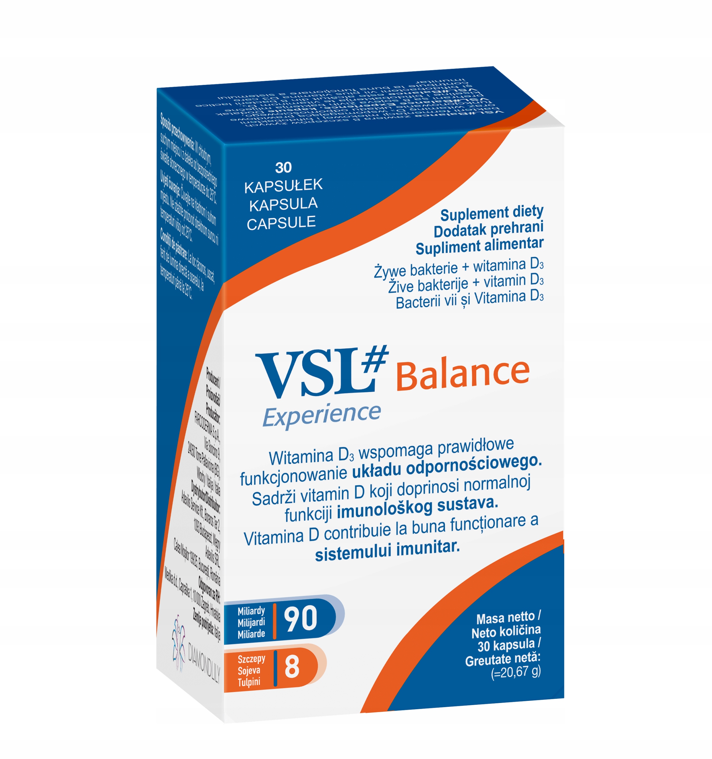 VSL#Balance является пробиотической пищевой добавкой , содержащей 8 штаммов живых молочнокислых бактерий и бифидобактерий, а также витамин D3, поддерживающий правильное функционирование иммунной системы. системе.