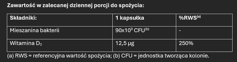 Состав: Бактериальная смесь*, растительная капсула (гидроксипропилметилцеллюлоза), кукурузный крахмал, антислеживатель: магниевые соли жирных кислот, холекальциферол (витамин D3).