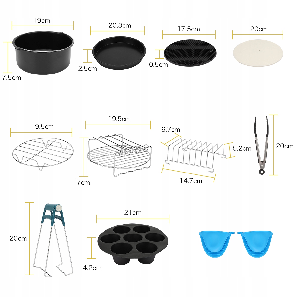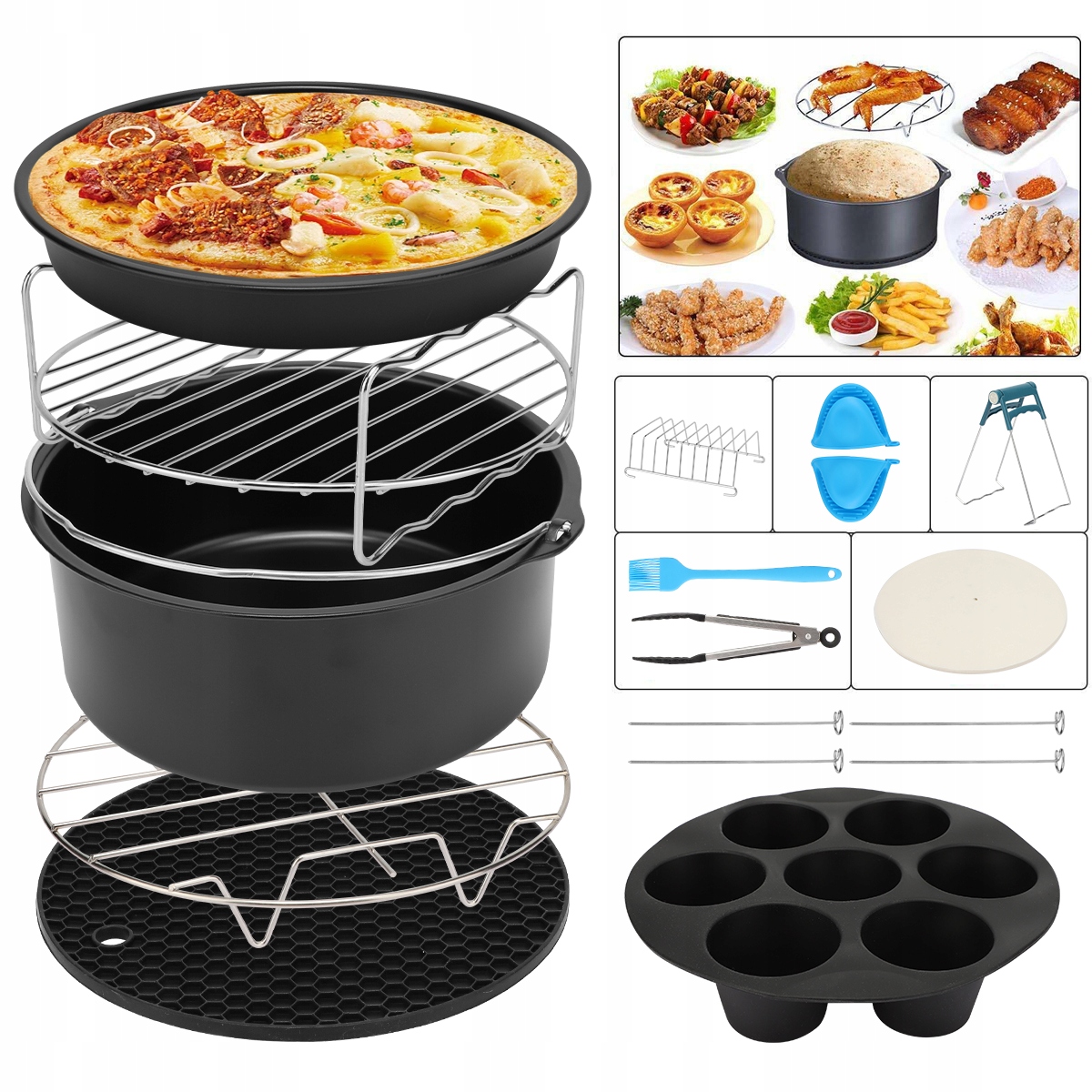 Набор аксессуаров включает в себя форму торта, поднос для пиццы, форму с 7 департаментом кекса, силиконовый коврик с соты, круглая решетка, круглый двойной -slayer Grabecue Great, Grill Scareers, Тестовая подставка для хлеба, выпечка, пищевая зажима, миска для миски, силиконовая масляная щетка и силиконовые кухонные перчатки