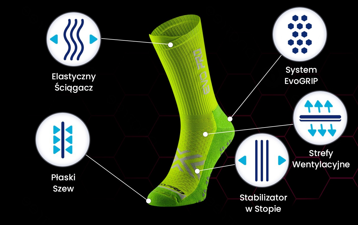 Вы сыты на горло скользящими носками в обуви во время матча или тренировки? Вы хотите увеличить свои возможности на поле? Мы разработали профессиональные футбольные носки с системой сцепления с неразличимыми сцеплениями, особенно для вас. Вы, наконец, сможете насладиться идеальной стабилизацией во время дриблинга и выстрелов! Благодаря EvoPro, вы также увеличит свою скорость и динамику.