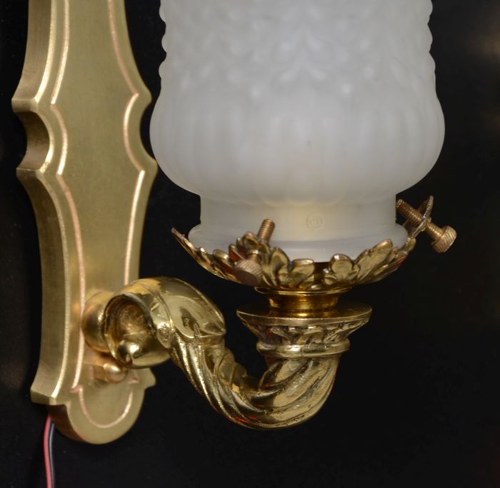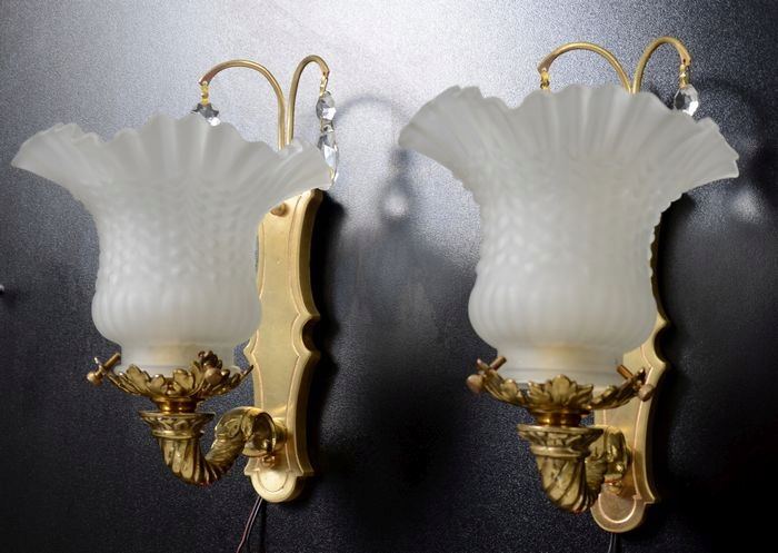 Тема аукциона - невероятно оригинальный набор из двух настенных ламп из Испании 1960 -х годов. Споры сделаны из золотой латуни. Место, где настенная лампа прикреплена к стене, имеет невероятно оригинальную форму. Внутренние руки в центре выходят изнутри, которые украшают красивыми оттенками. Оттенки изготовлены из твердого молочного стакана имеют элегантный фаррик наверху. Решающим преимуществом набора является небольшой фонтан с кристаллами подвесного стекла. Удивительная точность, забота о каждой детали, простоте и необычной форме делают брачные действия настоящими уникальными. Набор твердый и в то же время очень декоративный.