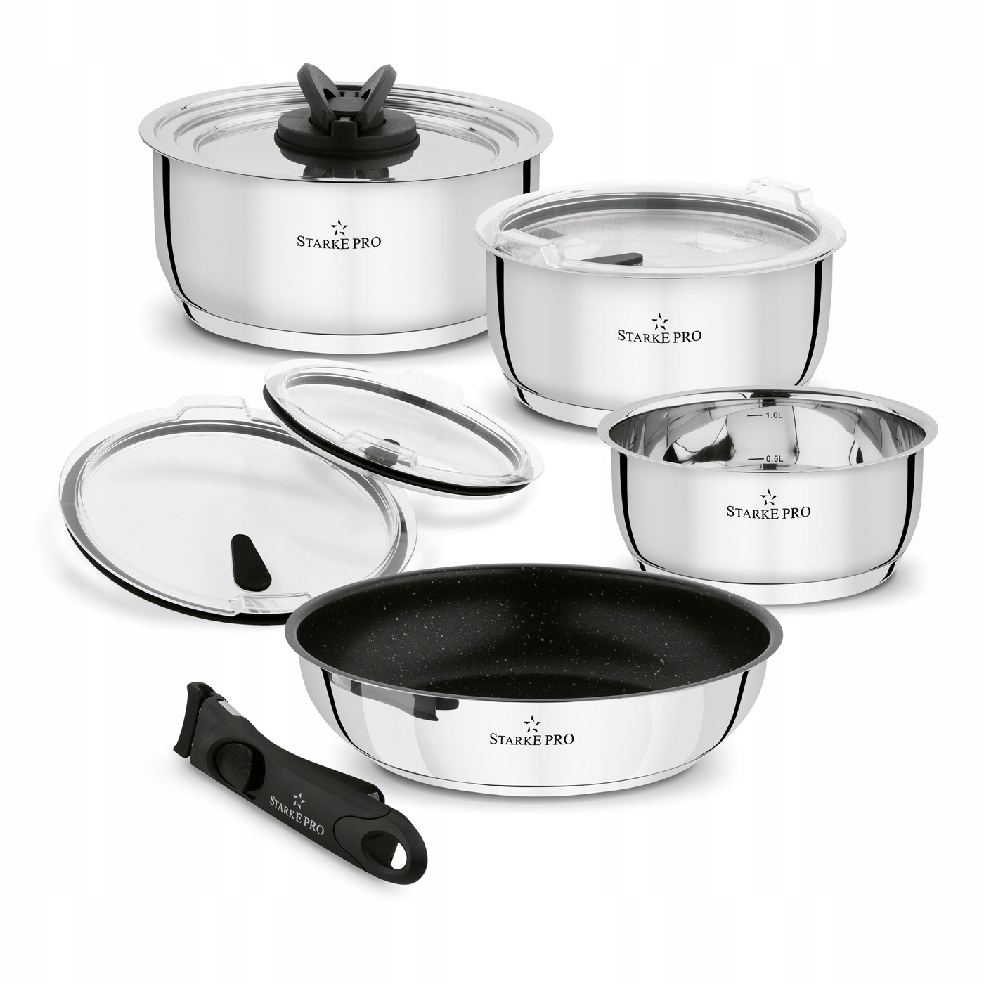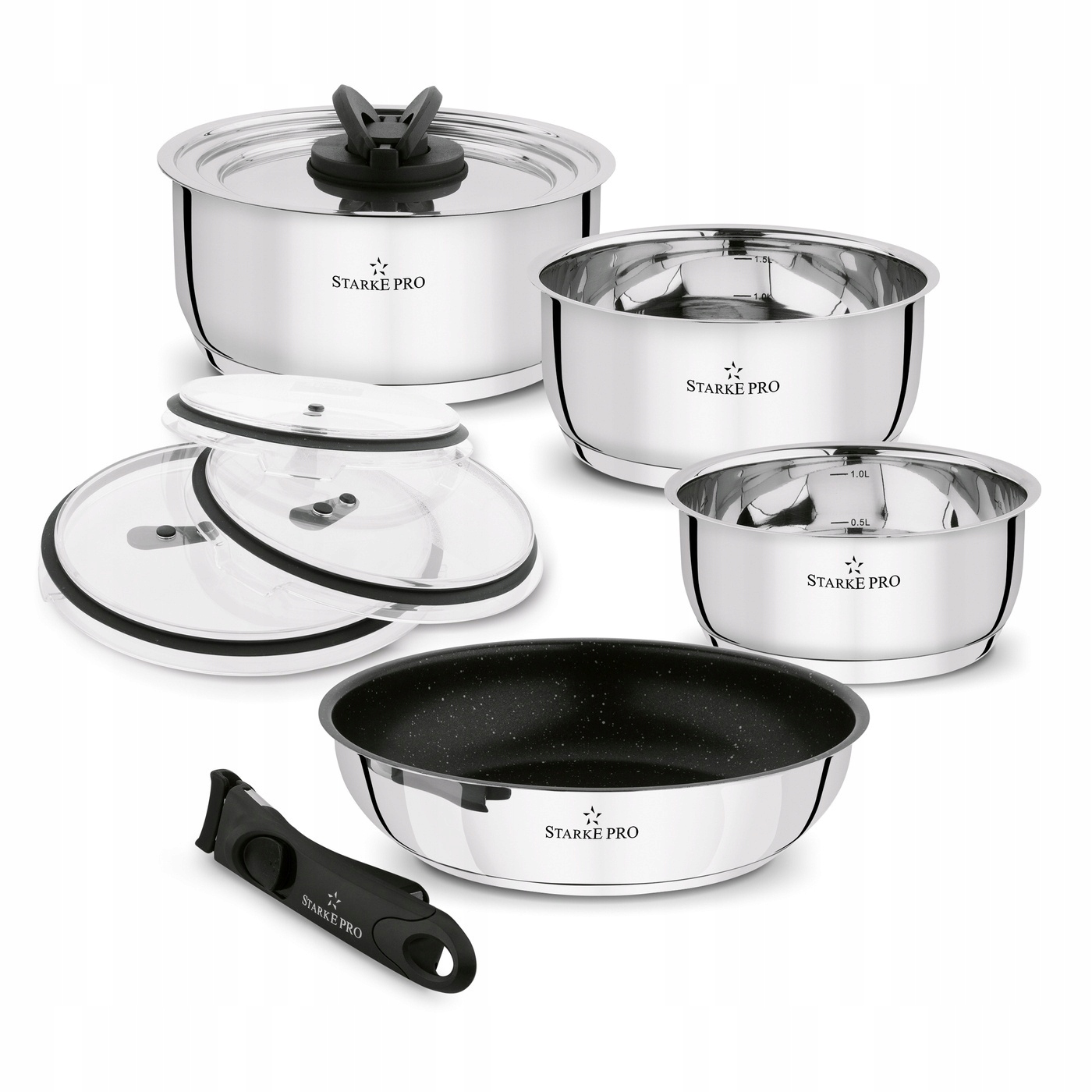 Установите 3 -кратную кастрюлю с съемной крышкой Starke Pro решить 9 EL -ручку