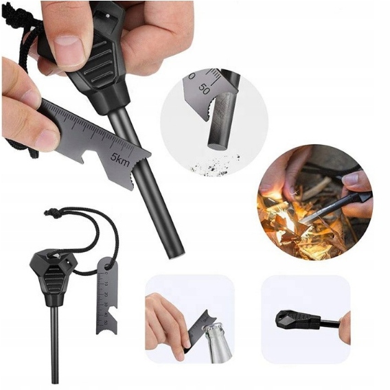 Надежный Tinder позволит вам зажечь огонь во всех условиях. Ручка Tinder оснащена сигнальным свистком. Пластина куртки, включенная в набор, также имеет меру и открытие бутылок.