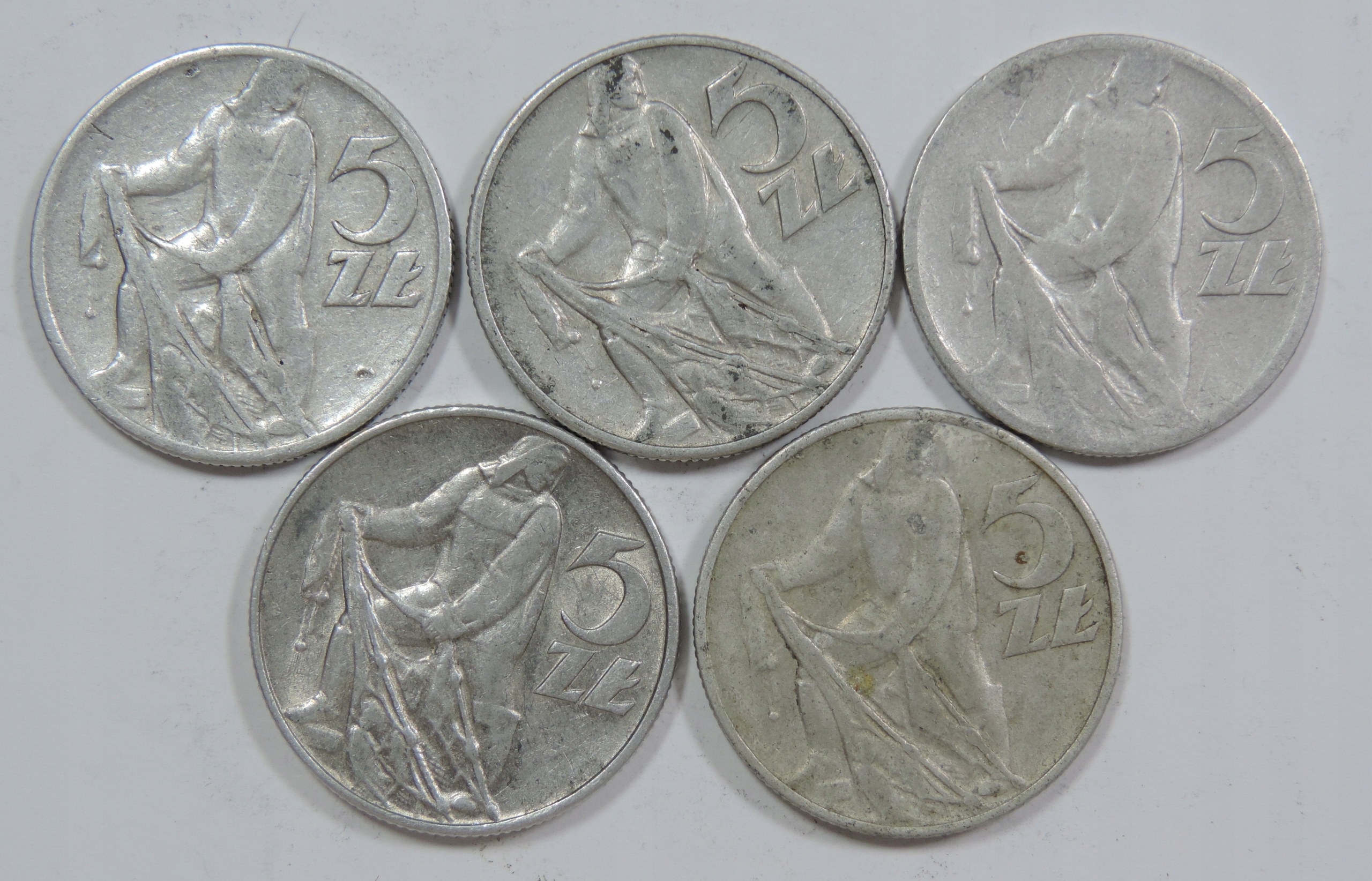 Установите 5x циркуляционная монета - польская PRL - 5 Zlotys - rybak -oy4803