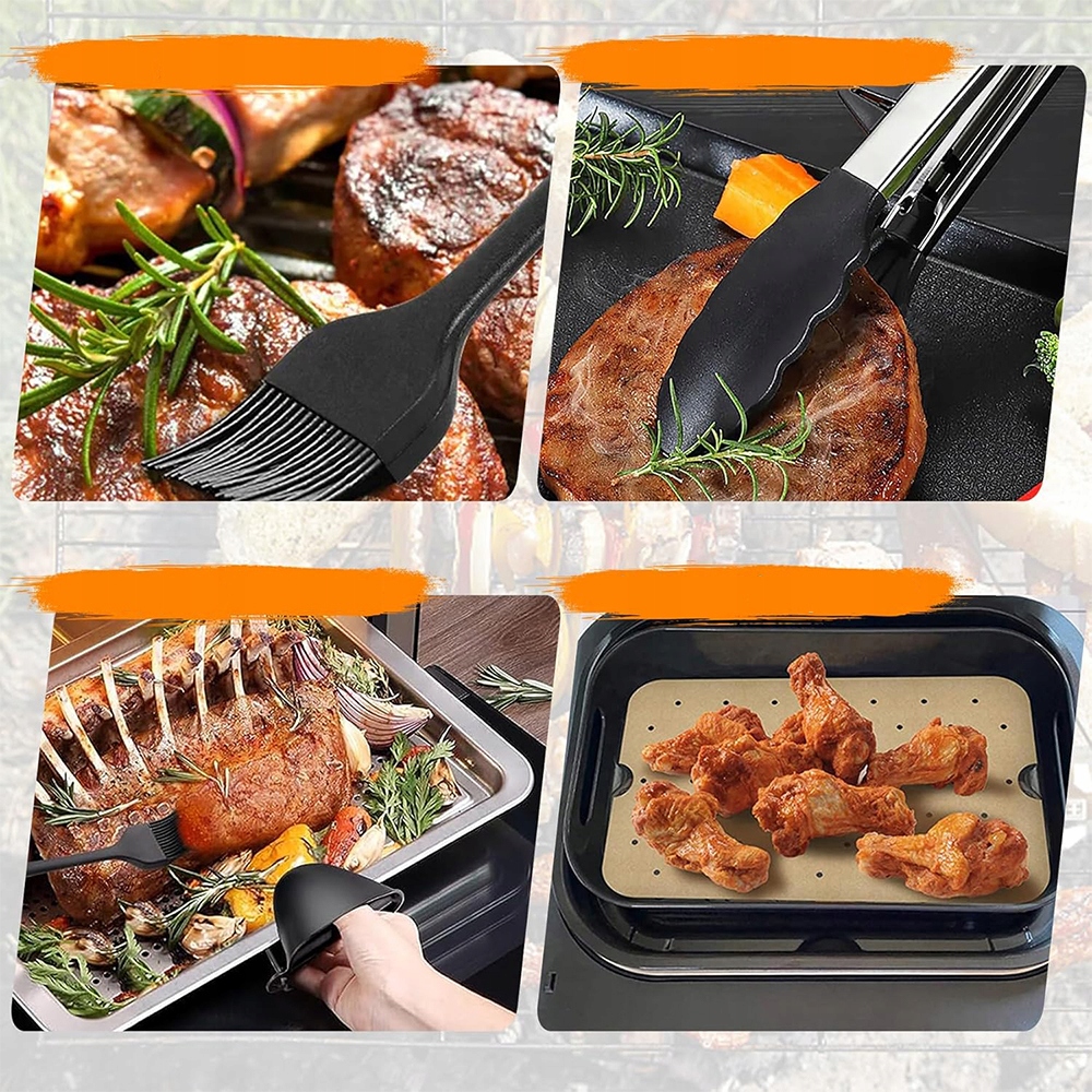 ⭐ 【9 -Частого набора аксессуаров】 - Каждая упаковка содержит 2 силиконовых корзина для форм, 1 многофункциональная металлическая подставка, 1 металлическая ручка шашлыка, 4 ручки для шашлыка, 1 пищевые плоскогубцы, 100 выпечка бумаги. простыни, 1 смазочная щетка и 2 силиконовые перчатки, которые помогут вам приготовить фри, жареную курицу, шашлыки и другие вкусные и полезные блюда, сохраняя время, энергию и уход】 - наши аксессуары с воздухом предназначены для повседневного использования. и комфорт. Вы можете мыть в посудомоечной машине, они устойчивы к ржавчине и легко чиститься, поэтому вам не нужно беспокоиться и долговечно 304 из нержавеющей стали и пищевого силикона в соответствии со строгими руководящими принципами контроля качества, которые предотвращают BPA и агрессивные материалы. Они могут противостоять высокой температуре и обеспечить долгий срок жизни