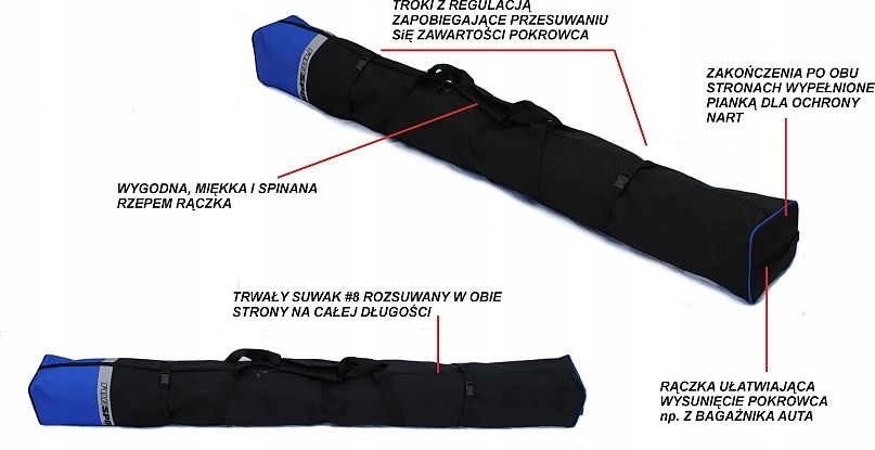 Крышка изготовлена из водонепроницаемой и чрезвычайно прочной ткани нейлона тканей. Он будет размещать лыжи до 155 см или 165 см