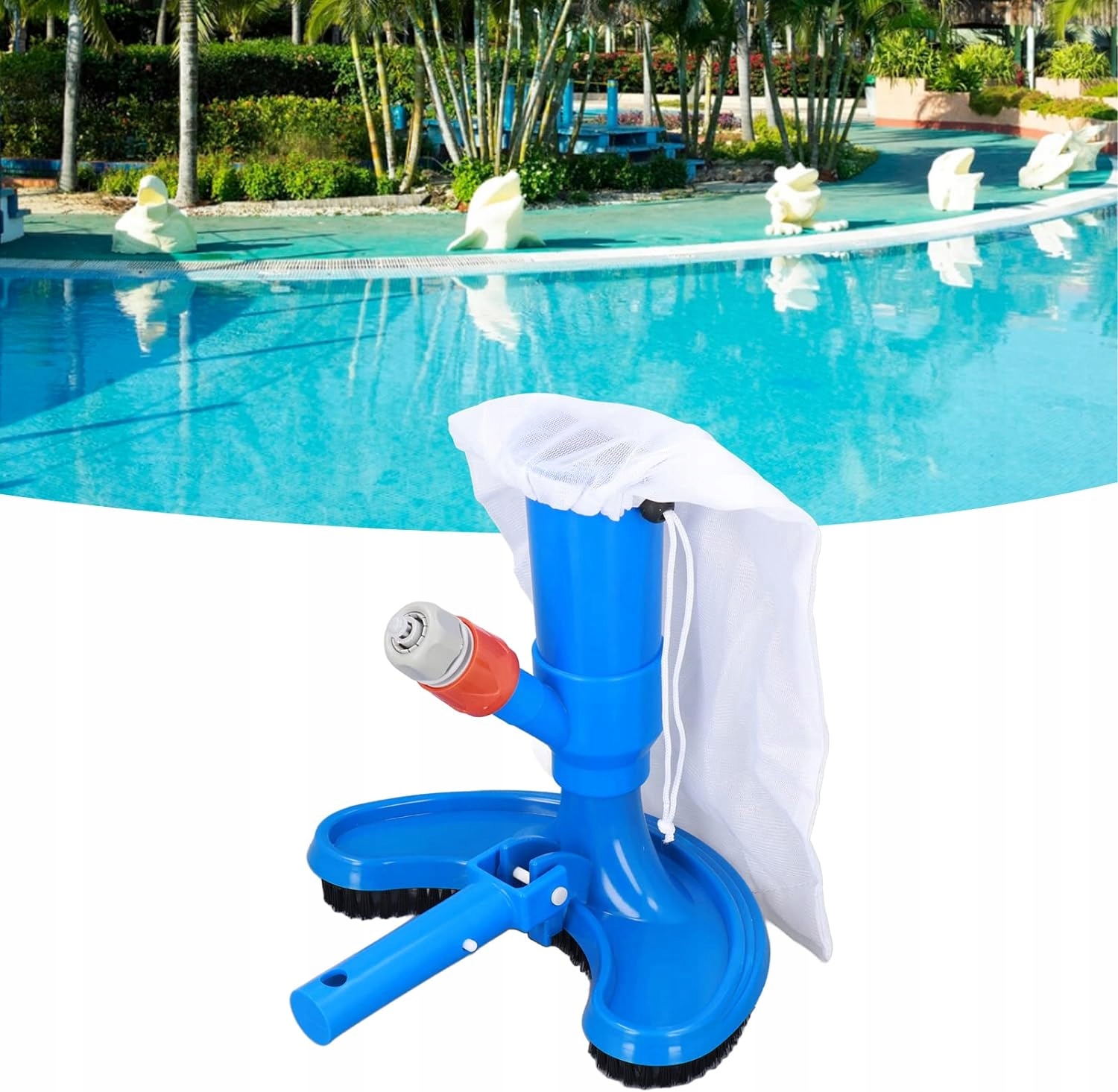 Наш пылесос использует давление воды из садового шланга. Благодаря давлению воды, пылесос чистка высасывает загрязнение в сумке и дает чистую воду обратно в бассейн.