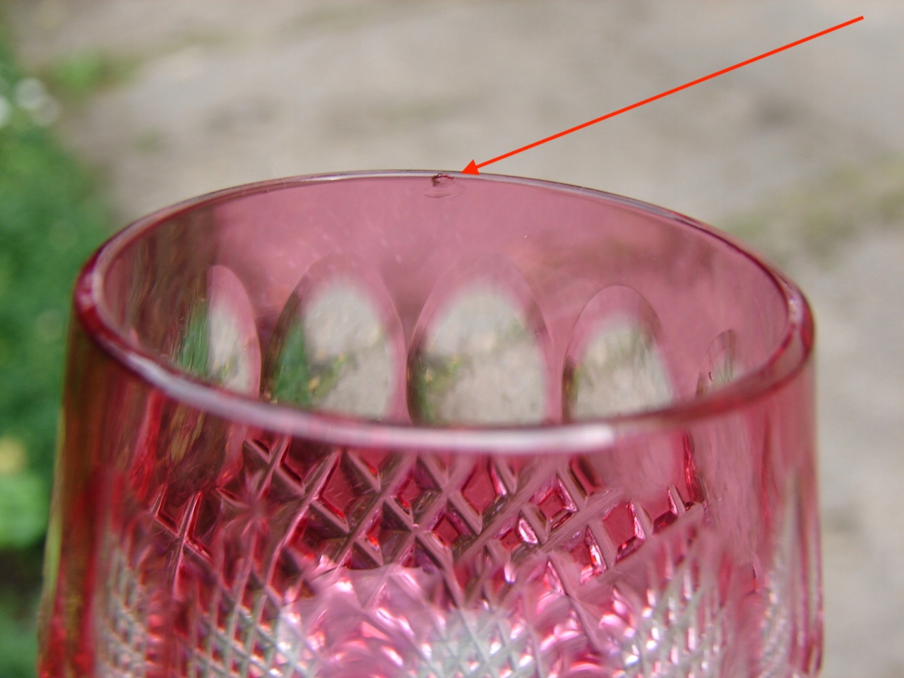 одно стекло во внутренней части под краем имеет невозможности, которое не обижено и не влияет на использование и появление. Место таблицы при высоком увеличении показано красной стрелкой.