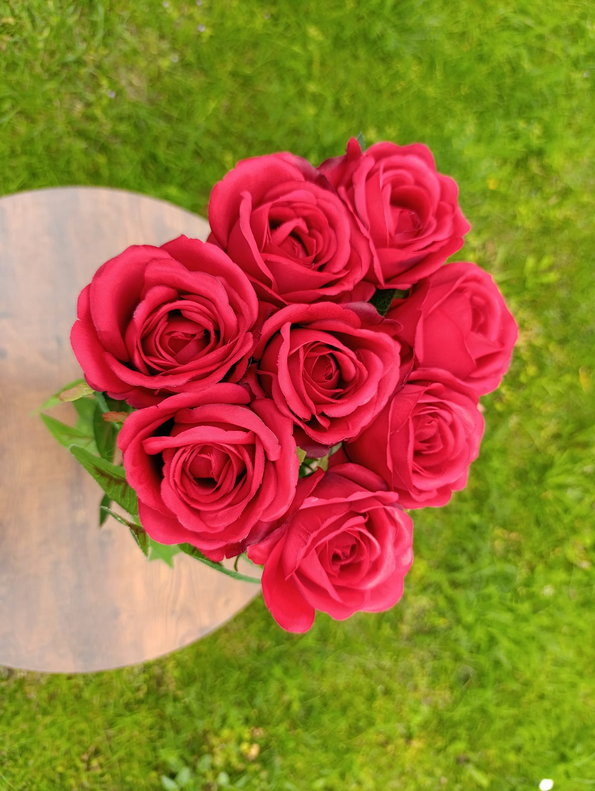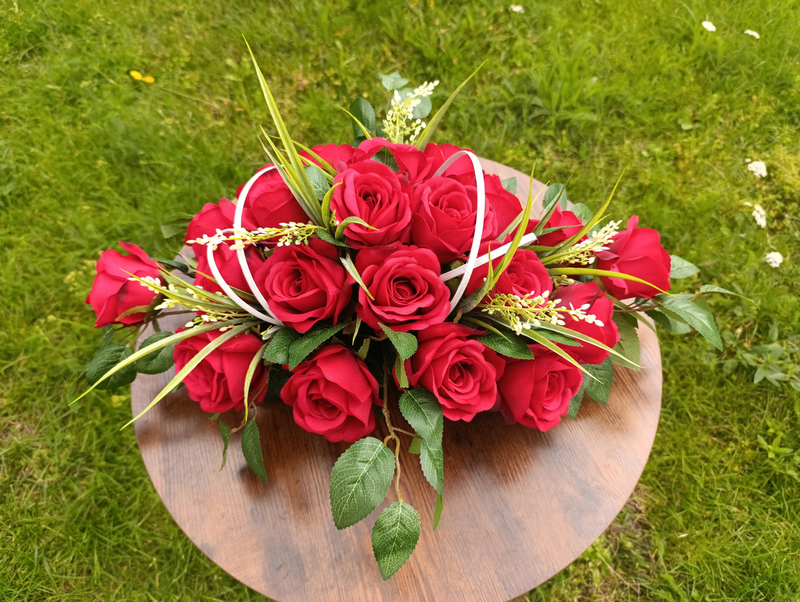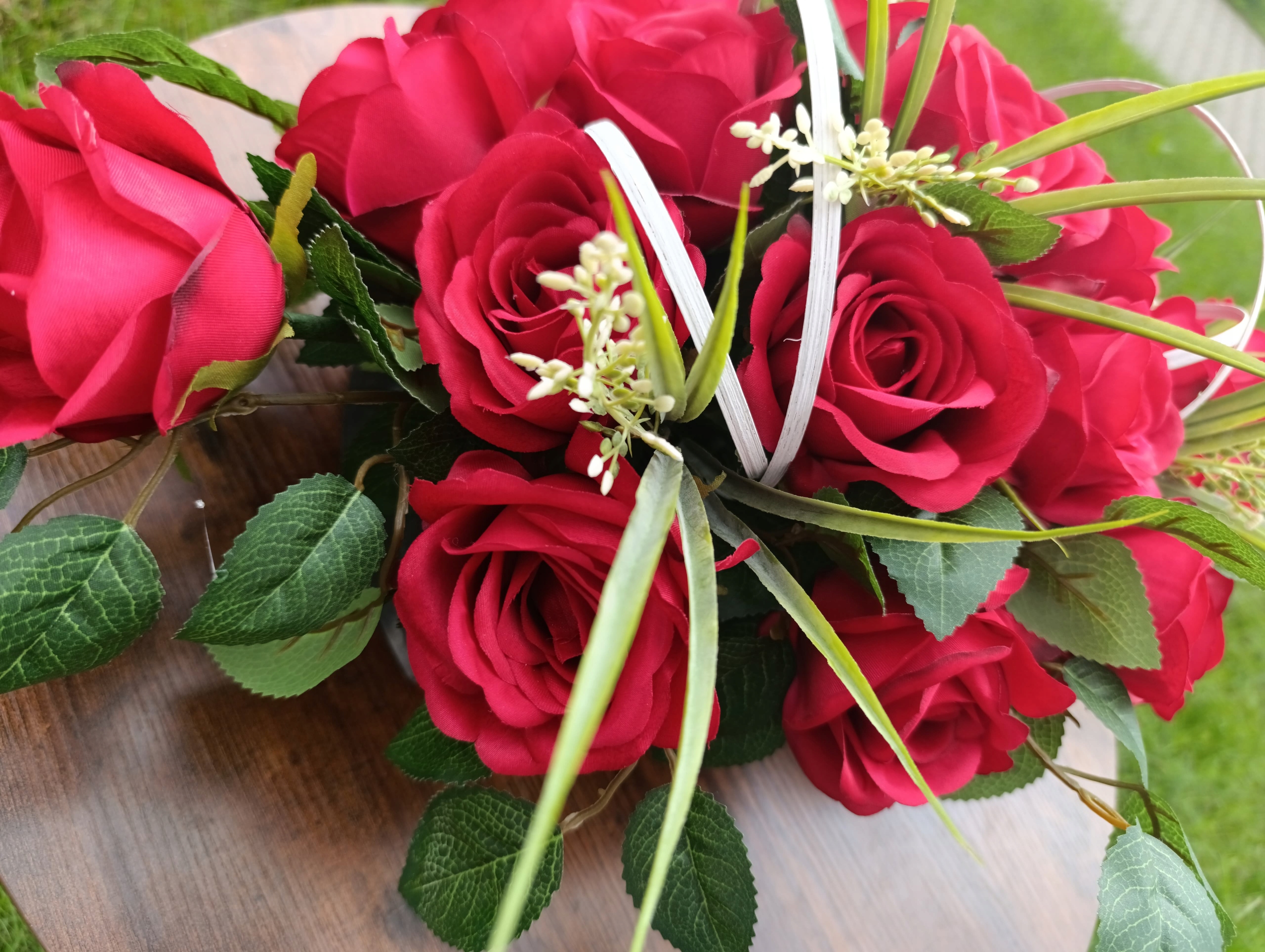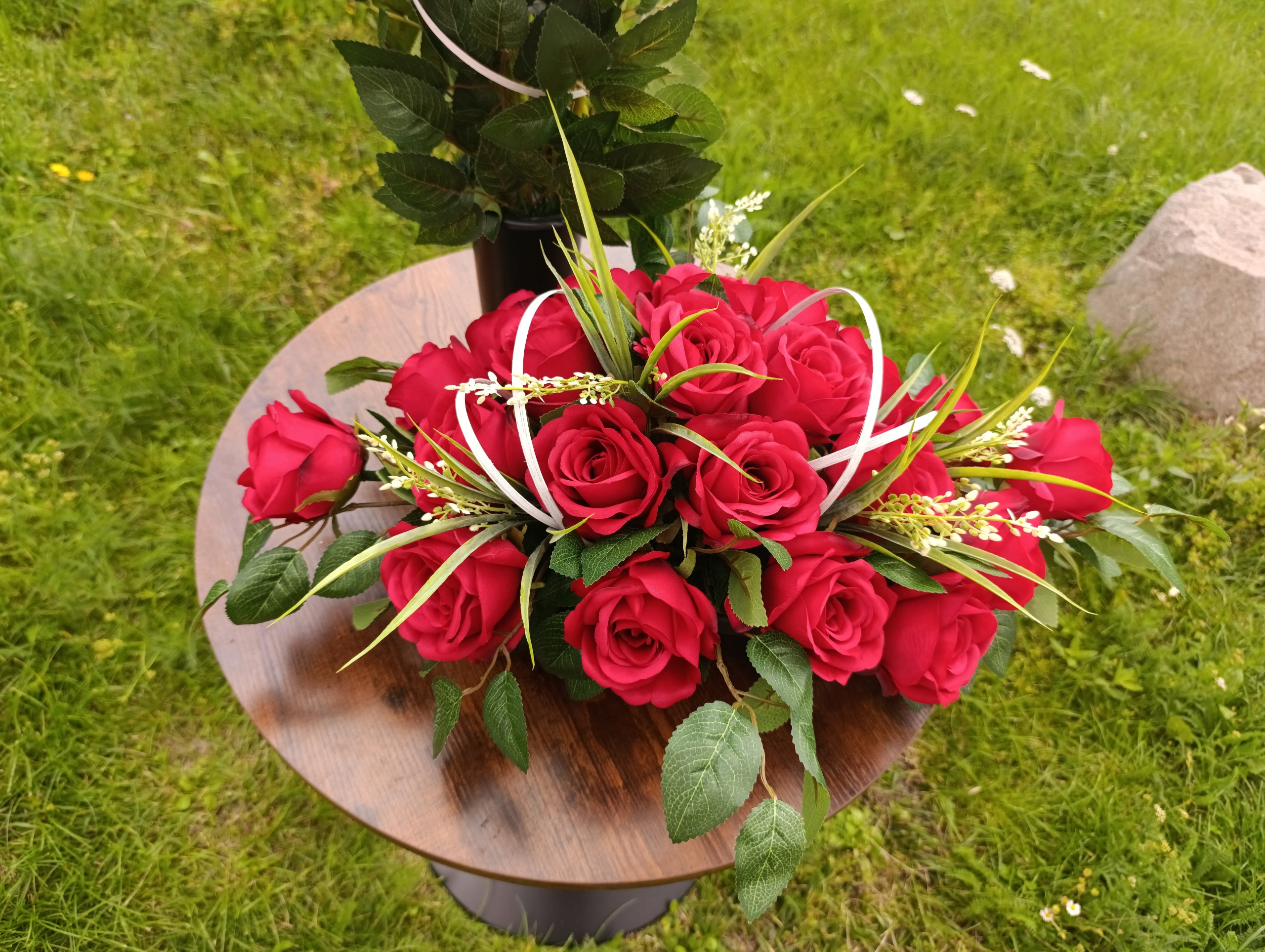 - украшение - букет с пластиковым горшком длиной 35 см! дополнительно загружен цементным раствором из искусственных красных роз ПРЕМИУМ.