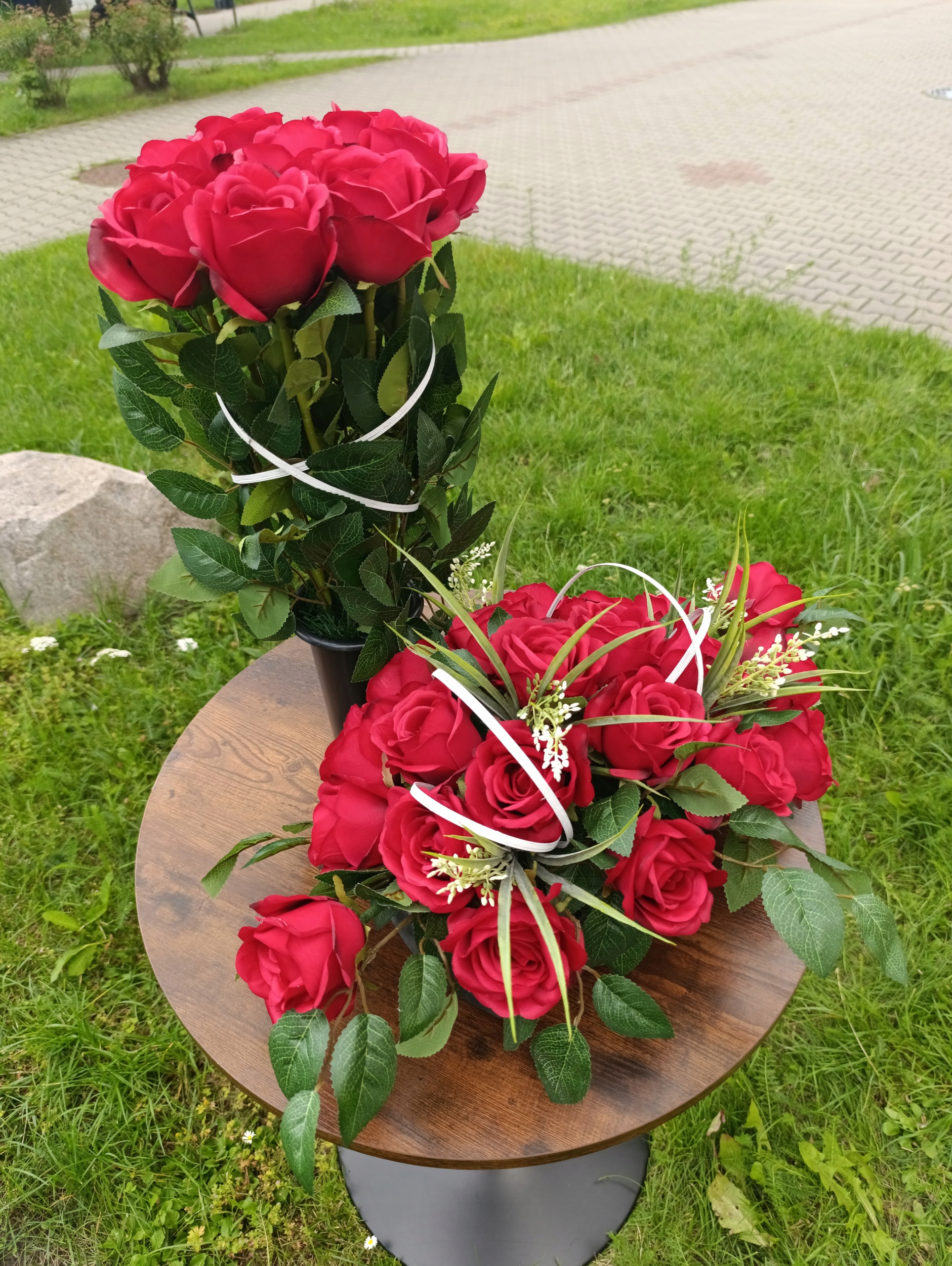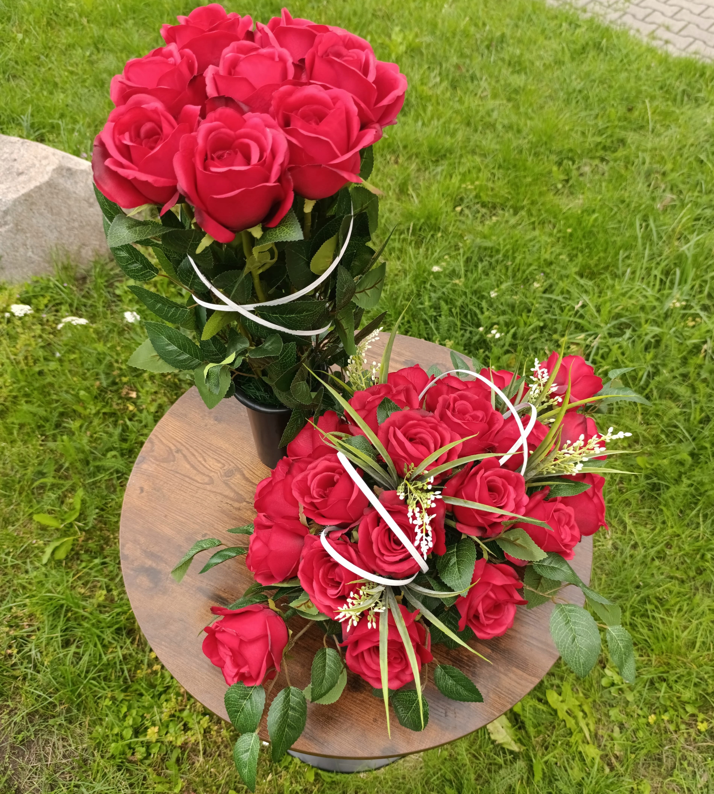 НАБОР ДЛЯ КЛАДБИЩА - ДЛЯ ВСЕХ СВЯТЫХ - ИЗ ПРЕМИУМ ЦВЕТОВ КРАСНЫХ РОЗ (диаметр 10 см!) + БУКЕТ ДЛЯ ВАЗЫ 2-в-1