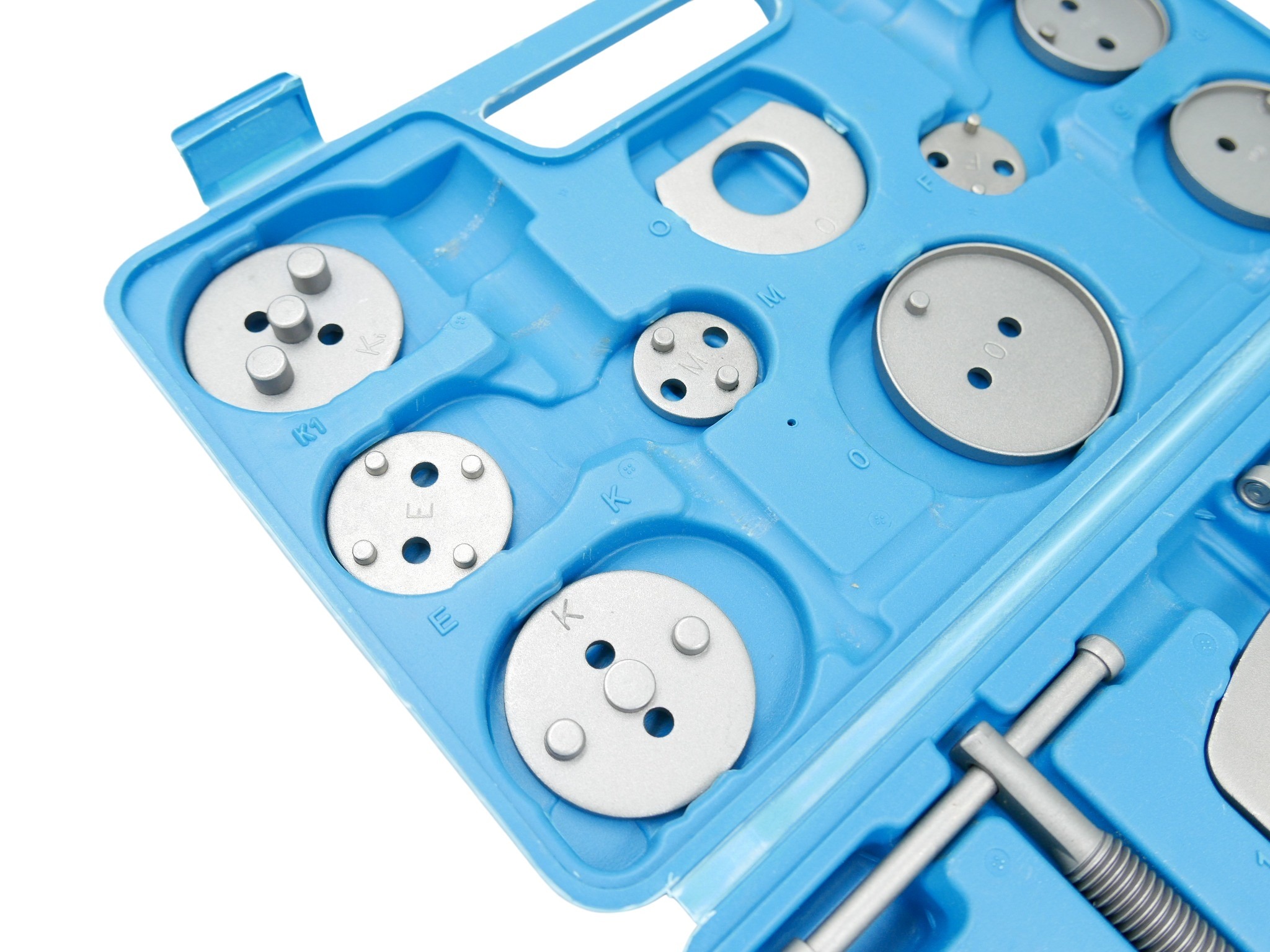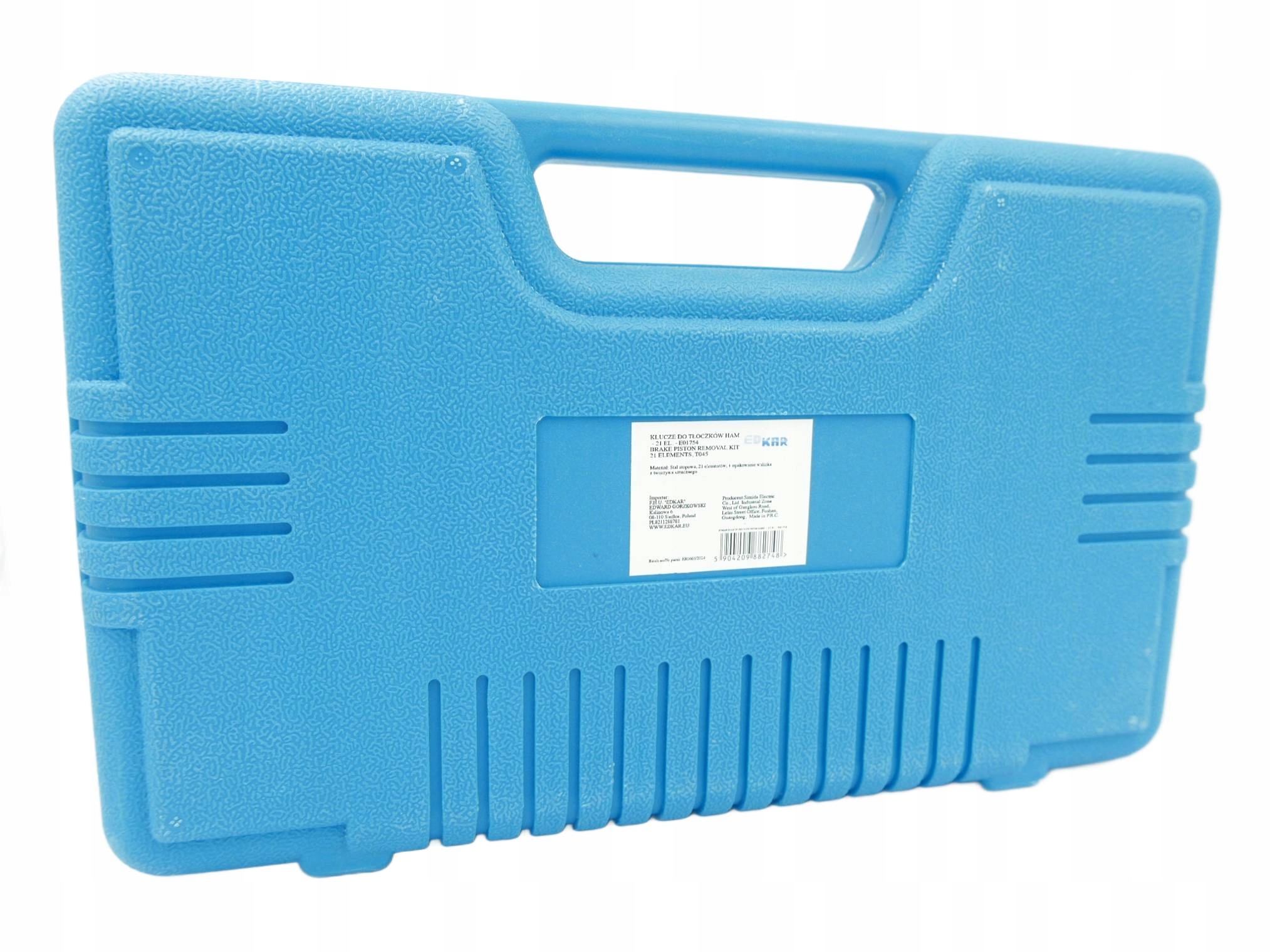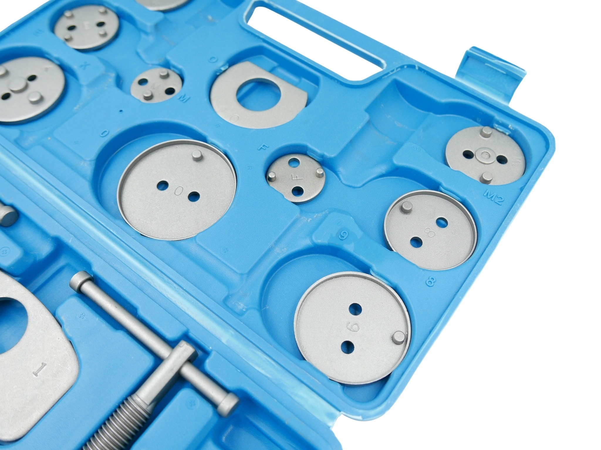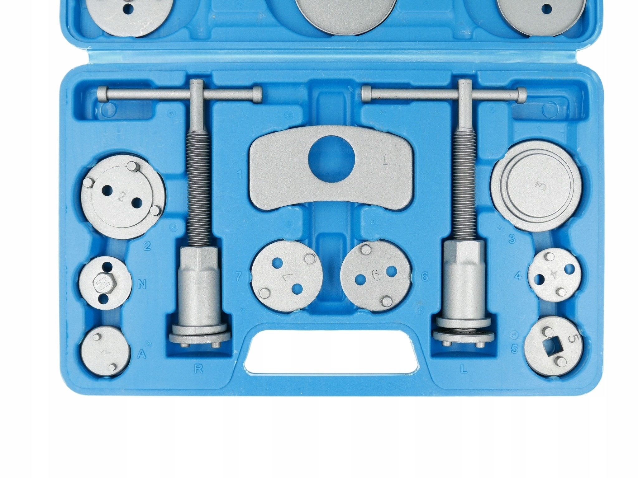 ⭐ 21 Элементный набор для переворота/сжимания поршней в тормозных цилиндрах , необходимый для ремонта транспортных средств, оснащенных дисковыми тормозами. для каждого автомобильного семинара, где он помогает ускорить обслуживание тормозных систем. Набор подходит для большинства автомобилей на рынке, благодаря тому, что он чрезвычайно универсален. Набор доставлен в чемодан с организатором, а все его элементы изготовлены из высококачественных материалов, устойчивых к потреблению. Луч, предназначенный для прикрепления пресса с седлом, оснащен магнитным наконечником, благодаря которой он поддерживает тарелку, которая соответствует данному поршню в оси