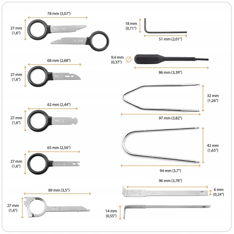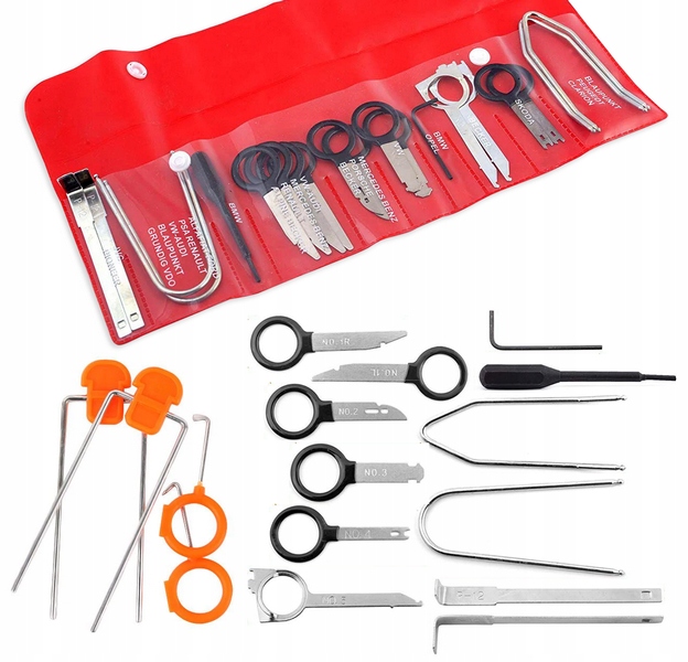 Ключевой комплект для установки/ демонтажа автомобильного радио. Он используется как на домашней мастерской, так и на профессиональном веб -сайте. Ключи сделаны точно так, чтобы не повредить радио или кабину. Skoda, BMW, Opel, VW, Mercedes Benz, Porsche, Audi, Renault, Alfa, Fiat. , Пионер