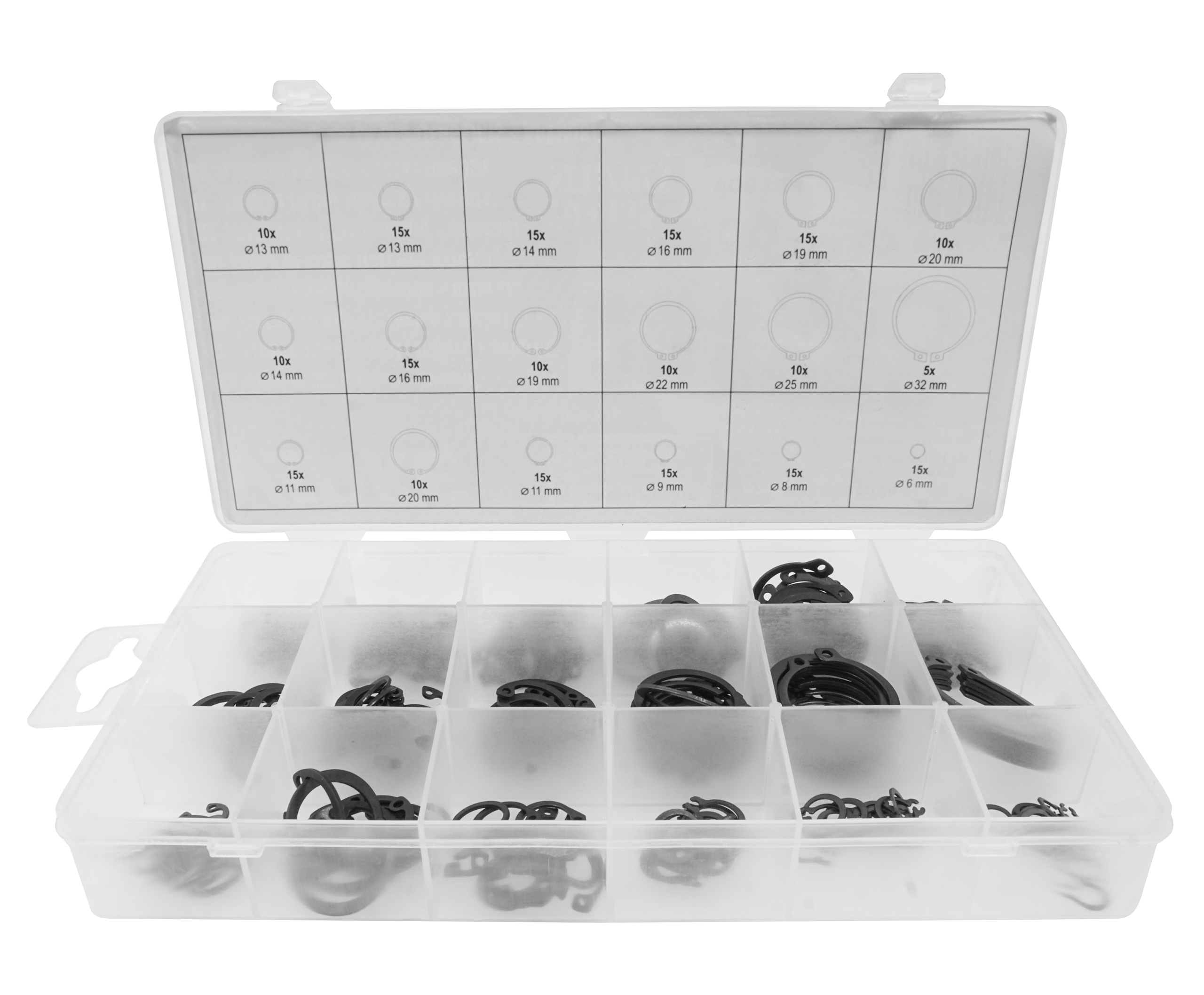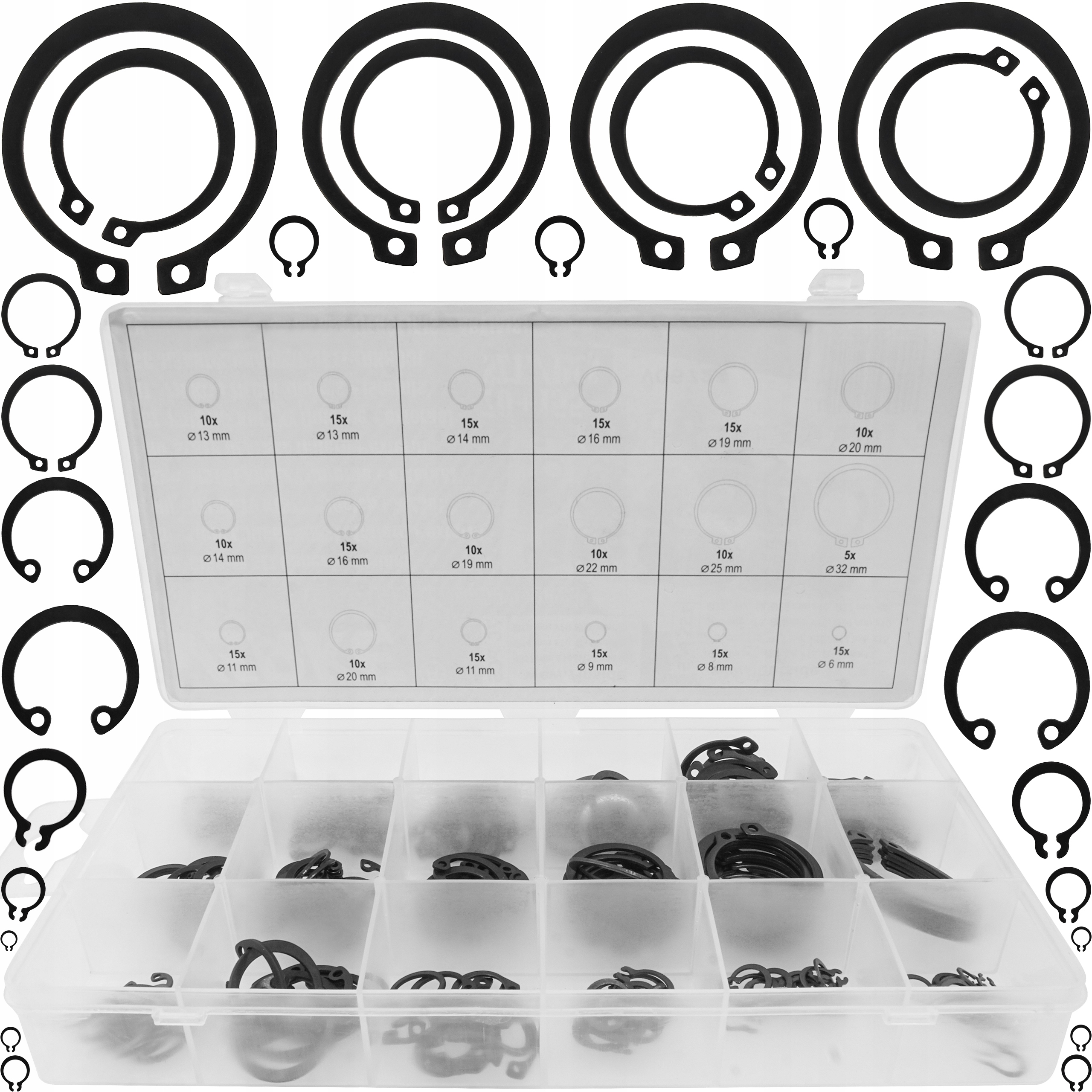 - наружные кольца Зегера х155 (Ø6 мм х15, Ø8 мм) х15, 09 мм х15, 011 мм х15, 013 мм х15, 014 мм х15, 16 мм х15, 19 мм х15, 20 мм х10, 22 мм х10, 25 мм х10, 32 мм х5)