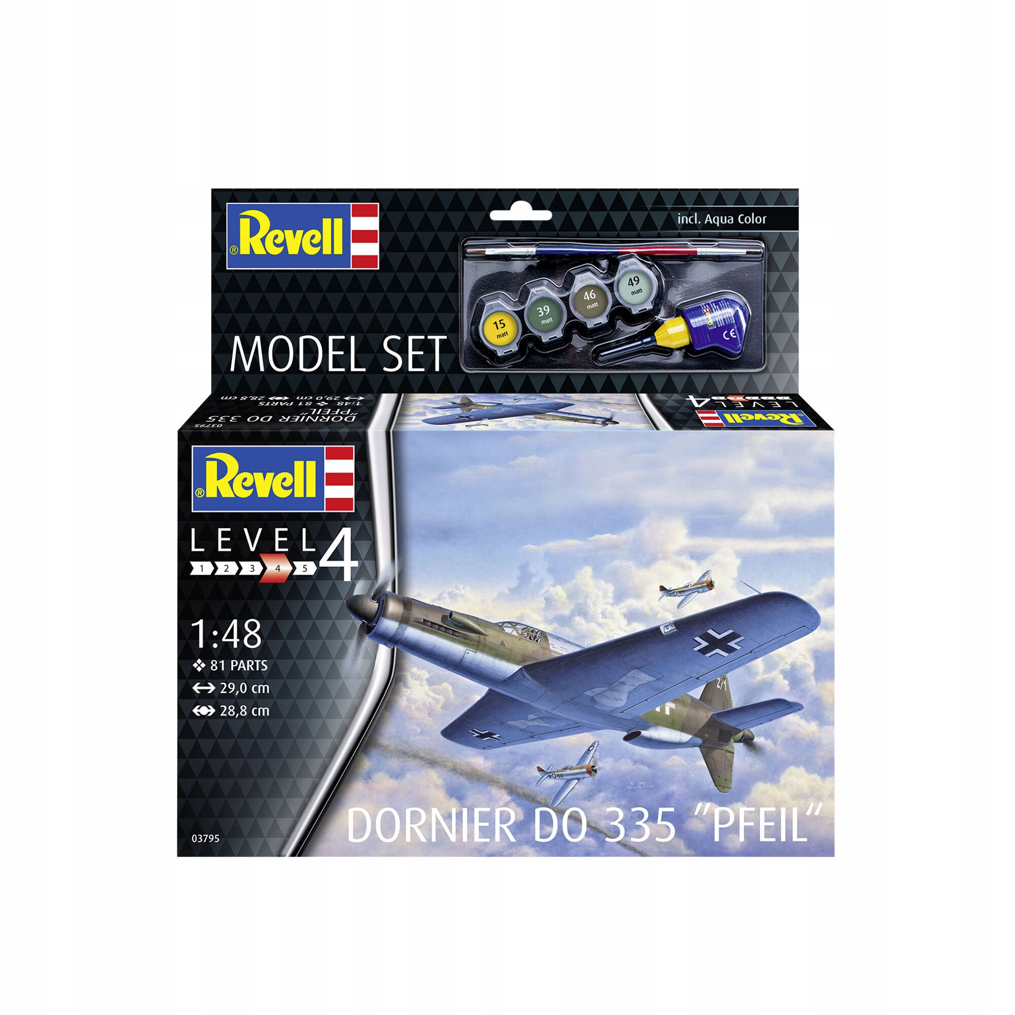 Дорнье был до 335 немецкого мультиподотного боец, произведенного Дорнером во время Второй мировой войны. Необычный для строительства немецких самолетов, у него был один двигатель спереди и один сзади. Благодаря этому, до 335 это был самый быстрый самолет, работающий на поршневом двигателе во время его первого полета в 1943 году, для которого он в конечном итоге получил прозвище «Стрелка». - точно воспроизводимая структура крыльев - фигурки в наборе - Исторические наклейки - в дополнение к основным цветам красок, набор также включает клей и кисти