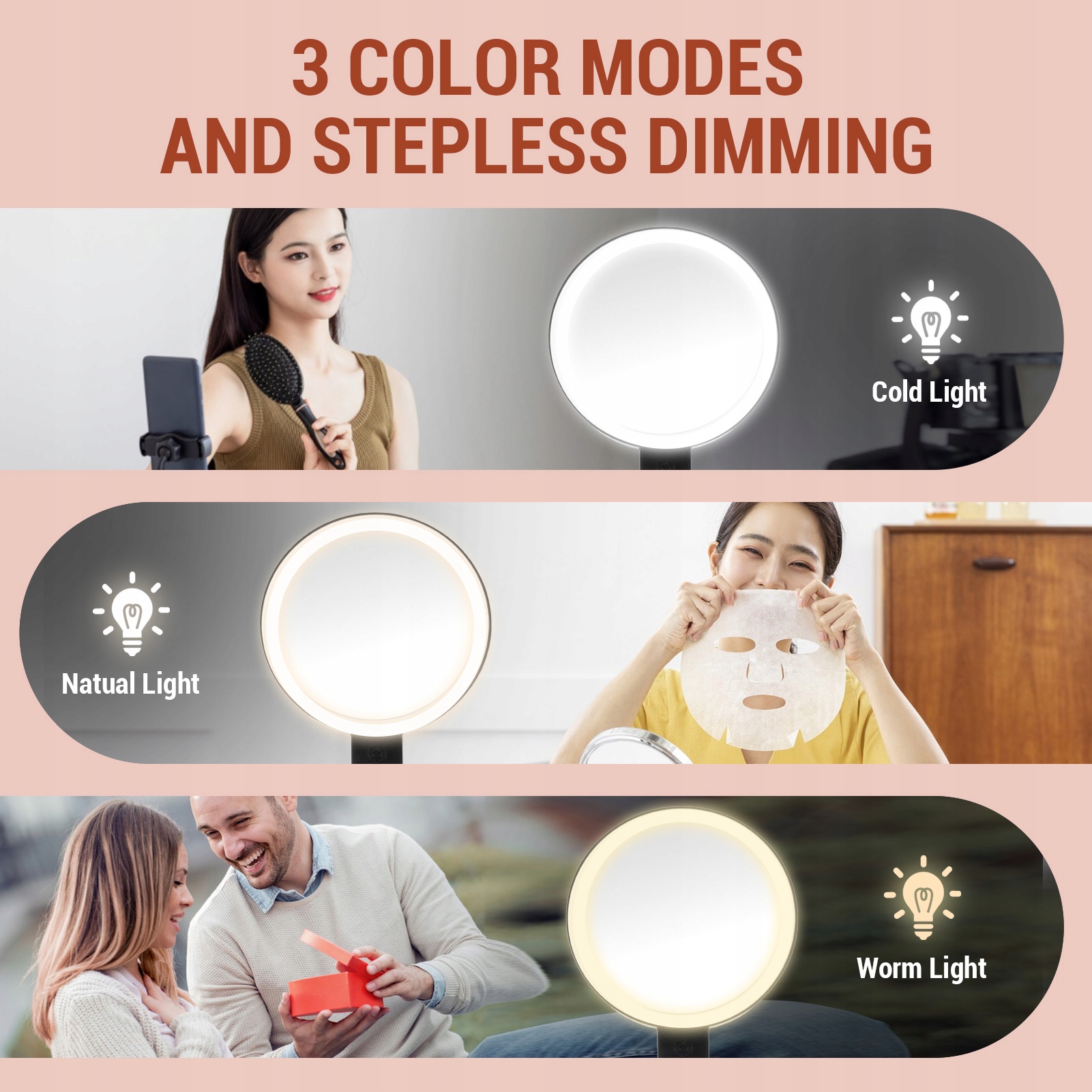 4. Короткое пресс изменяет цветовую температуру, а длинное пресс адаптирует яркость. С 64 светодиодными чипсами с высокой яркостью и дизайном в форме кольца освещение равно равномерное и яркое, обеспечивающее видимые каждую деталь.