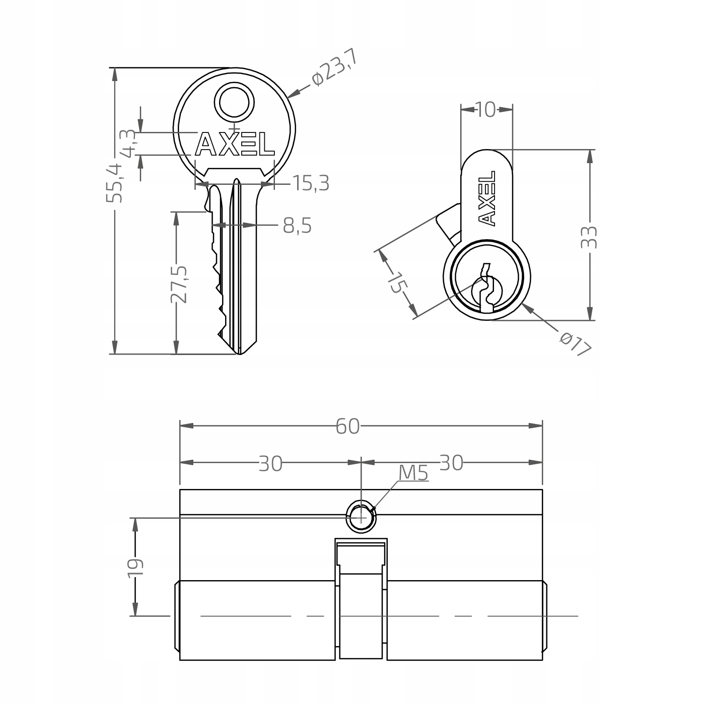 ВСТАВКА ЦИЛИНДРА AXEL 30/30, 5 НАШИВОК, 4 СТАЛЬНЫХ КЛЮЧА, ЦВЕТ ЛАТУНИ