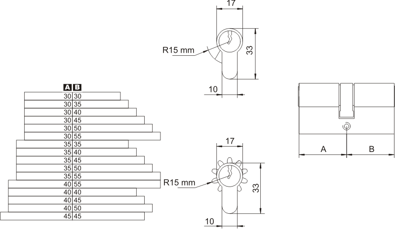 Чтобы правильно подобрать дверной цилиндр, необходимо определить размеры А и Б представлен на рисунках ниже. При измерении длины вставки следует учитывать толщину дверных знаков, которые будут крепиться к двери. Длина вставки состоит из двух размеров A и B, которые измеряются до оси крепежного винта. Измерьте размеры А и В и запишите их как 40 мм/45 мм. Если это вставка с ручкой, то также необходимо указать, с какой стороны она должна располагаться. ПРИМЕЧАНИЕ: Чтобы табличка на двери надежно защищала вставку от попыток взлома, она не должна выступать за пределы таблички более чем на 3 мм.