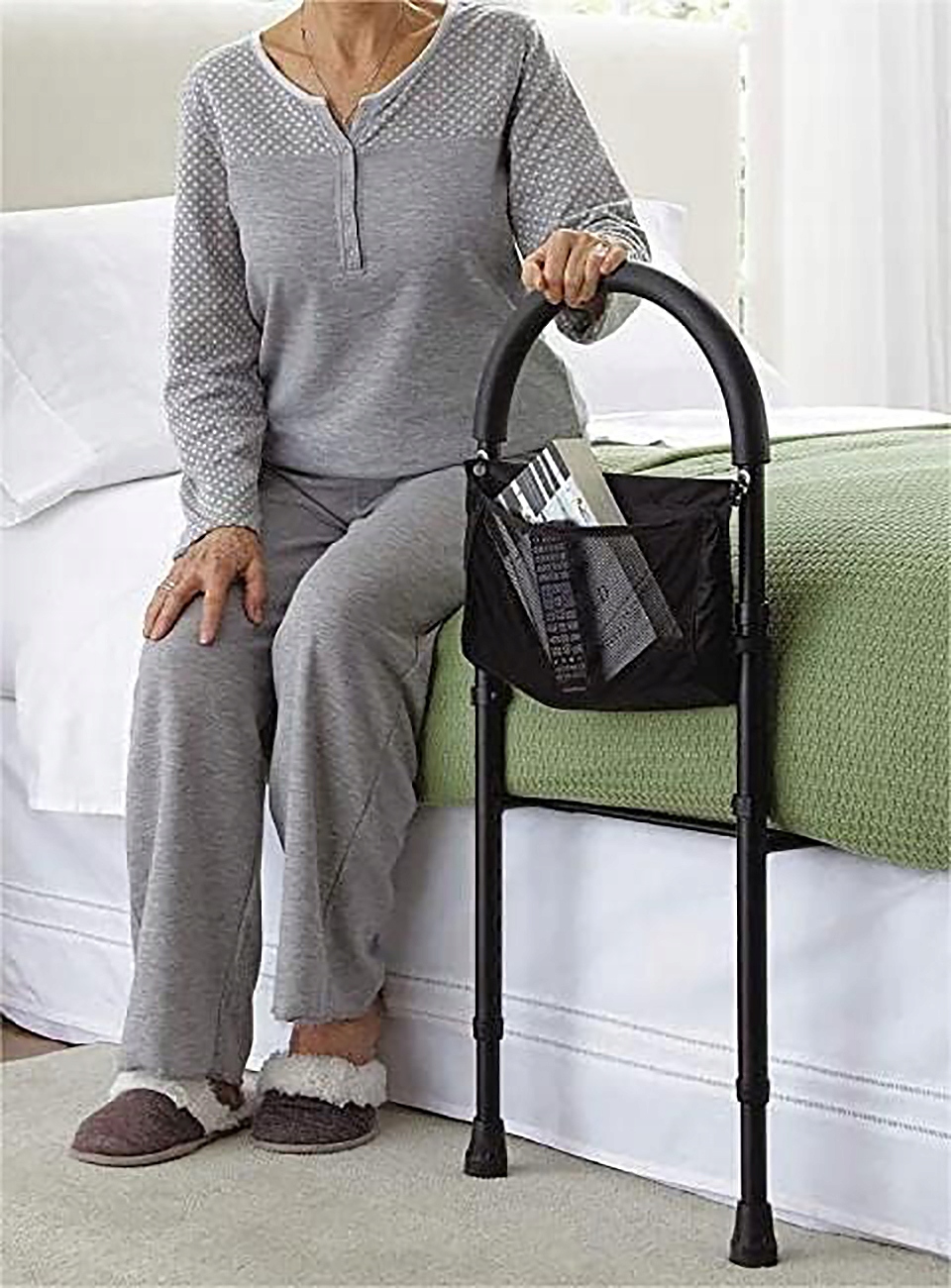 Опорная рама включает в себя съемную сумку для хранения. В этой сумке можно хранить повседневные личные вещи и аксессуары, такие как очки, книги, салфетки и медицинские принадлежности, не вставая с постели.