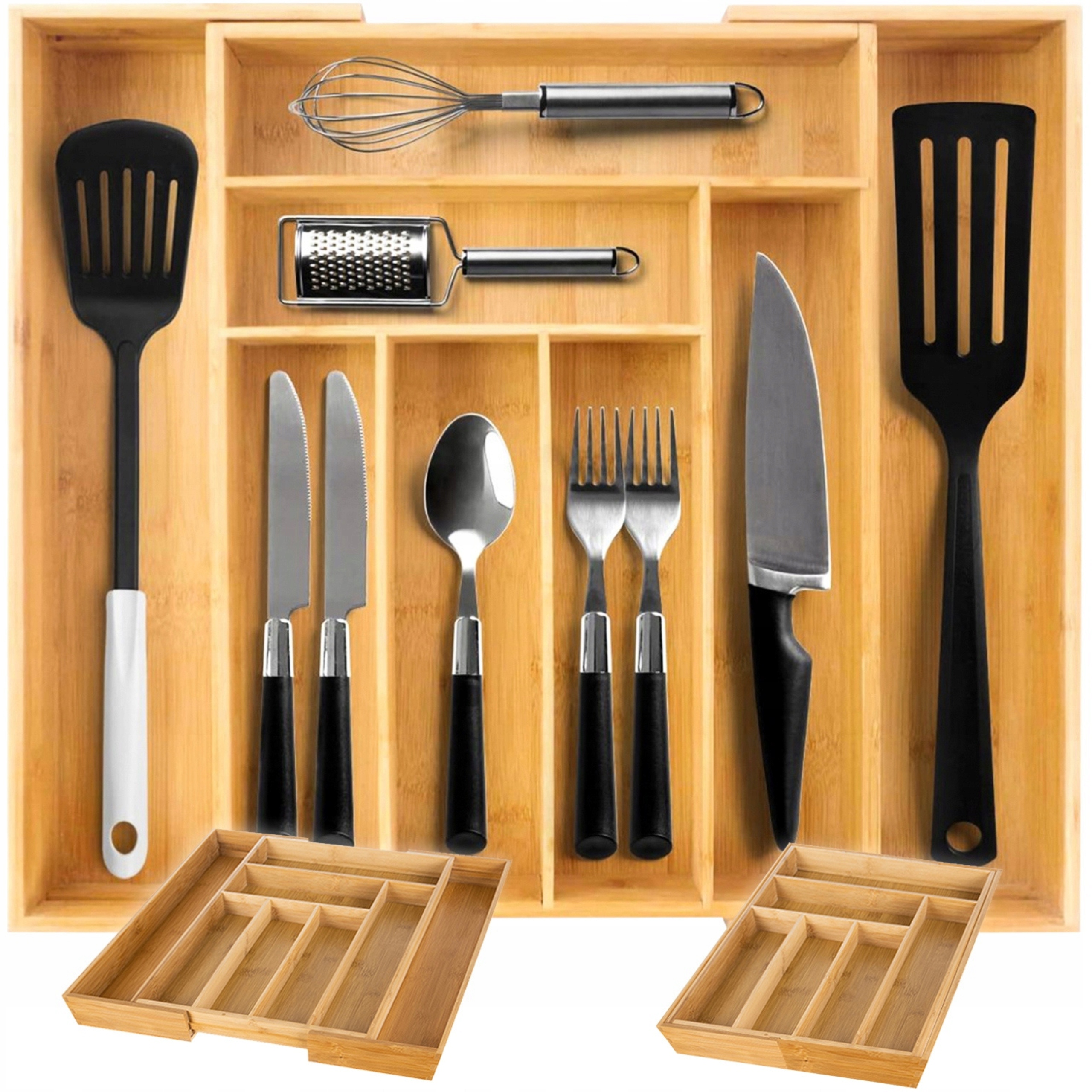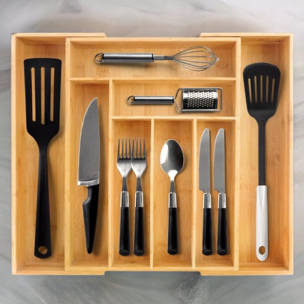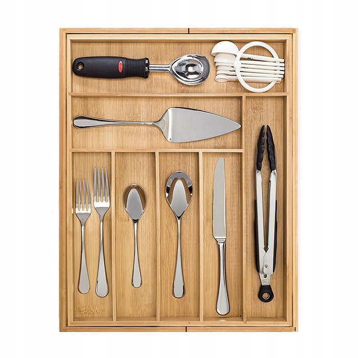 - Bamboo - организатор кухонного ящика из бамбукового дерева имеет простую форму, благодаря которой он соответствует современным кухням. Бамбуковая древесина является правильным материалом для производства кухонных аксессуаров, потому что он обладает быстроми сушильными свойствами, поглощает наименее бактерии и элегантна. Это вклад в ящик, поэтому мы можем свободно мыть под проточной водой, не опасаясь, что в нем будет развиваться древесина, а грибки и бактерии будут развиваться. Заказ - общая проблема при организации кухни - это держать заказ с незначительным оборудованием. Ложки, чайные ложки, ножи, вилки, ковш, спатулы - это лишь некоторые из предметов, необходимых на кухне, для которых вам нужно найти место. мы обычно храним их в ящике, чтобы они были под рукой.