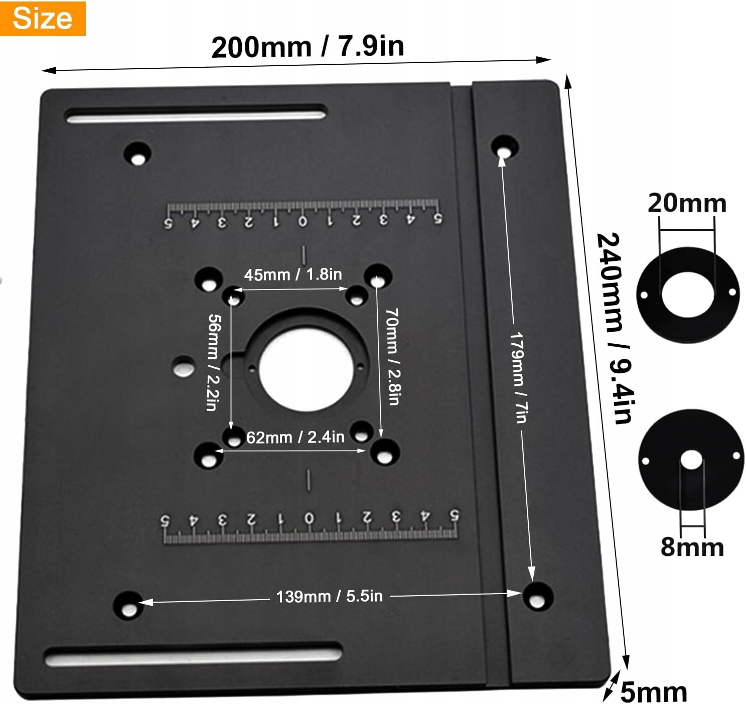 ✅【Высокая совместимость】: Эта вставка фрезерного стола идеально подходит для обрезки и фрезерования. Вставная пластина для фрезерного шаблона имеет размеры 200 x 240 x 5 мм и подходит для большинства электрических торцовочных и гравировальных станков. Чтобы убедиться, что плата подойдет к вашему маршрутизатору, проверьте размер маршрутизатора на подробном изображении продукта.
