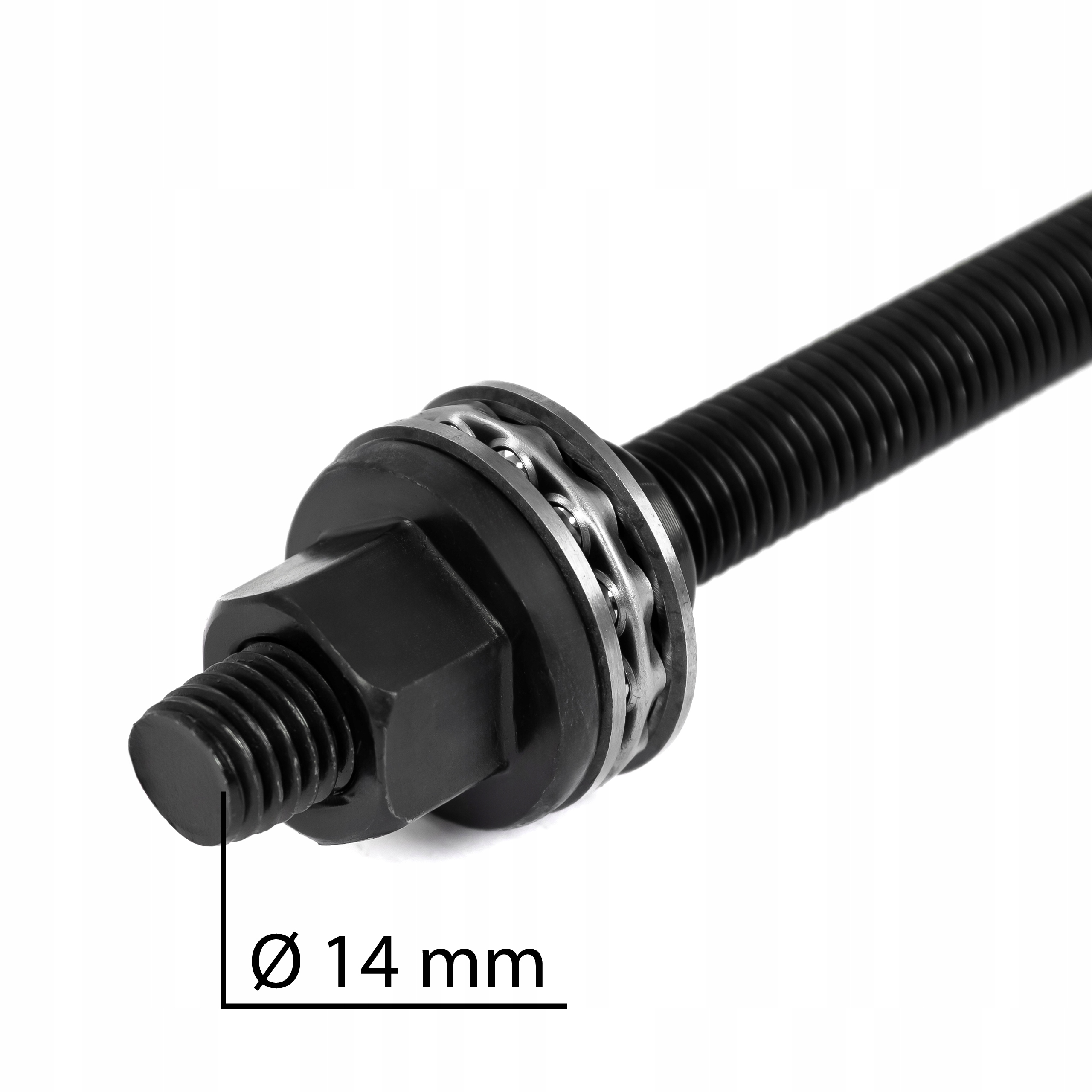 Винт М14 закаленный с двумя гайками шарикоподшипника, благодаря использованию гаек сила давления распределяется по всей поверхности кольца подшипники.