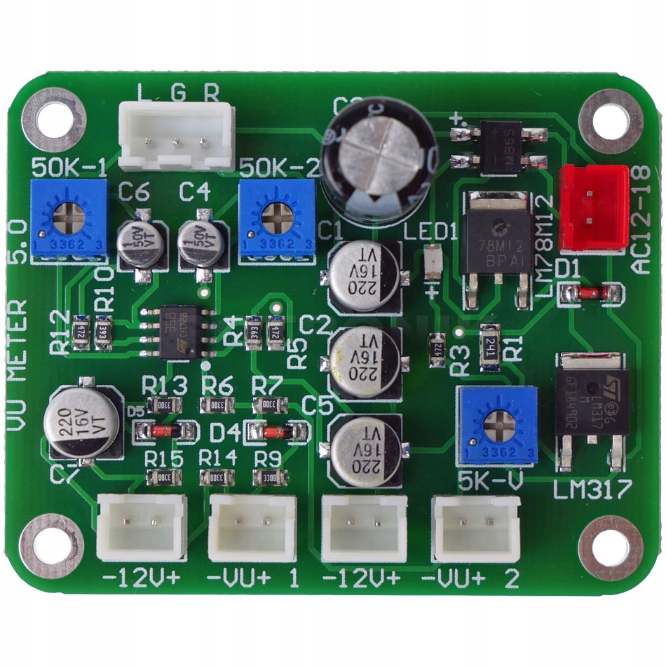 Измеритель уровня громкости, т. е. измеритель уровня звука. VU-метр — это аналоговое устройство, используемое для измерения мощности аудиосигнала, которое может сделать внешний вид усилителя или аудиосистемы более привлекательным. При изменении сигнала изменяется отклонение стрелки измерителя. Низкое потребление тока при напряжении питания от 6 до 12В. В качестве источника питания можно использовать трансформатор или источник постоянного напряжения, ведь счетчик может питаться как постоянным, так и переменным напряжением (для питания лампочки подсветки). Подсветка счетчика вольфрамовой лампочкой дополнительно придает устройству особый ретро-вид, что также улучшит визуальное восприятие при сборке аудиосистемы. Встроенный потенциометр служит для регулировки чувствительности устройства по каждому каналу отдельно. На плате есть места для пайки проводов. Конструкция выполнена из качественных элементов.