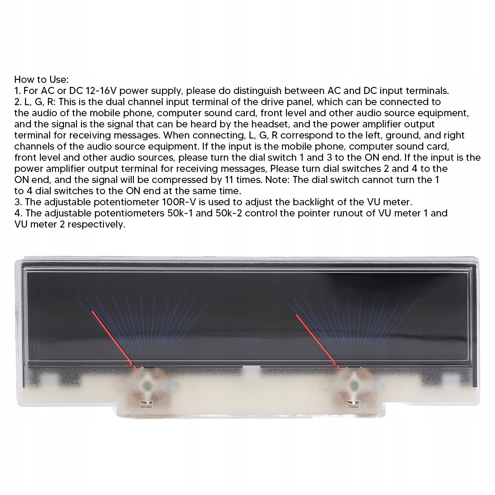 3. Регулируемый потенциометр 100R-V используется для регулировки подсветки индикатора уровня громкости.