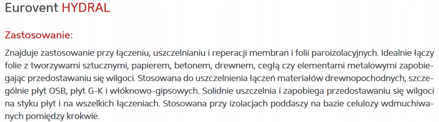 - Используется для герметизации сочетания материалов на основе древесины, особенно пластин OSB, G-K и волоконно-гипсовых плат. Сплошные герметизации и предотвращает вход в влажность в контакты с тарелками и во всех суставах. Используется для аттической изоляции на основе целлюлозы, надувшейся между стропилами.