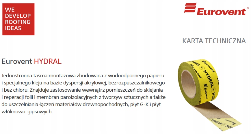 лента гидральной сборки Евровиент® из водонепроницаемой бумаги и специального клея, основанного на акрилине, не -reel и без дисперсии хлора. Он используется в помещении для прилипания и ремонта мембран фольги и паров, а также для герметизации соединений деревянных материалов, G-K и волокнистых пластин. Влага