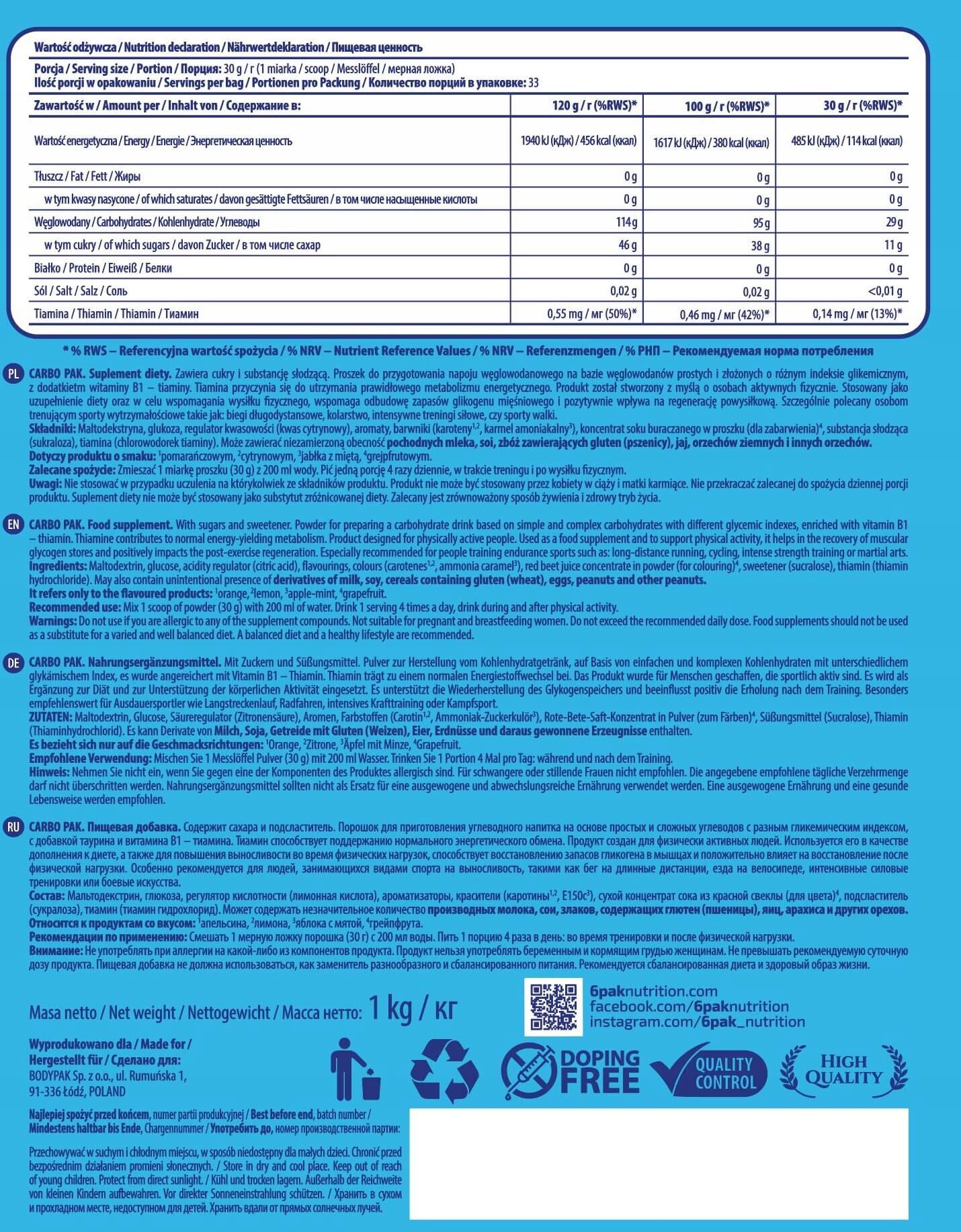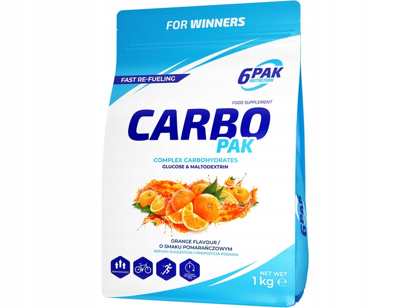 Carbo PAK — это пищевая добавка, содержащая сахар и подсластитель. Порошок для приготовления углеводного напитка на основе простых и сложных углеводов с различным гликемическим индексом, с добавлением витамина В1 – тиамина. Тиамин способствует поддержанию правильного энергетического обмена. Продукт создан для физически активных людей. Используемый в качестве пищевой добавки и для поддержки физических упражнений, он поддерживает восстановление запасов мышечного гликогена и оказывает положительное влияние на регенерацию после тренировки. Особенно рекомендуется людям, занимающимся видами спорта, требующими выносливости, такими как бег на длинные дистанции, езда на велосипеде, интенсивные силовые тренировки или боевые искусства.
