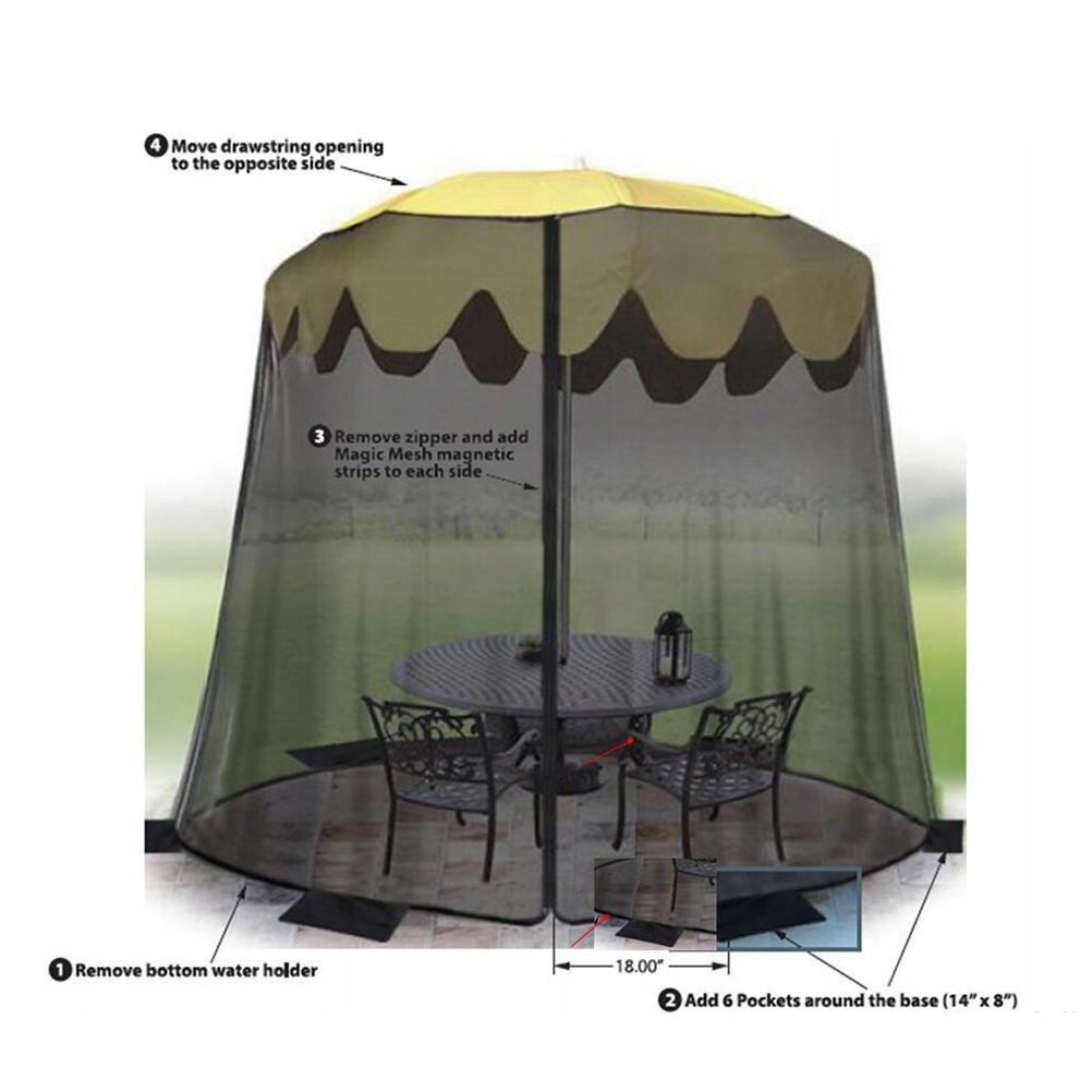 Хотите проводить больше времени на террасе, крыльце или лужайке, не беспокоясь о комарах, мухах, пчелах и других вредителях? Эта сетчатая сетка обернет ваш зонтик и стол, помогая вам расслабиться и насладиться едой на крыльце без насекомых! Вам не придется беспокоиться о вонючих свечах с цитронеллой или неэффективных спиралях от комаров. Просто наденьте сетку на зонтик, отрегулируйте веревку по размеру зонта, и больше никогда не беспокойтесь о том, что комары и пчелы снова нападут на ваш ужин.