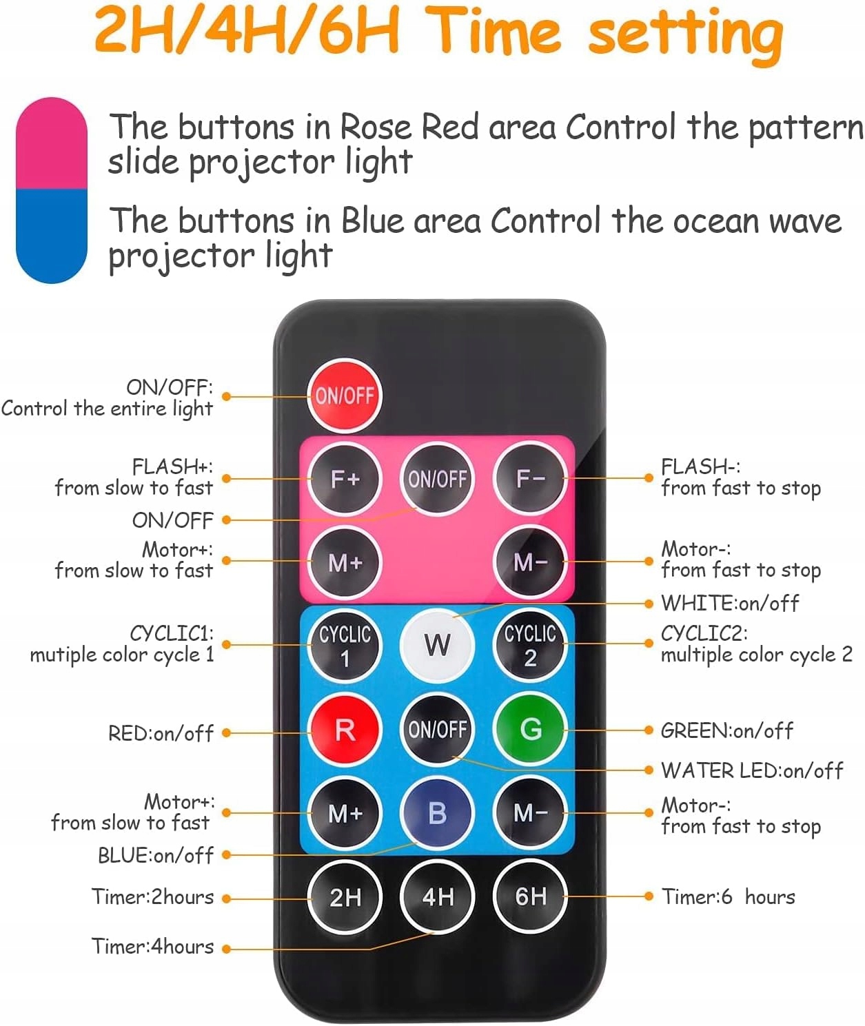 Рождественская светодиодная проекционная лампа имеет пульт дистанционного управления для выбора цвета света, скорости движения, таймера или настроек мигания. Дальность дистанционного управления до 12 м. Также имеется функция таймера с автоматическим отключением через 2 часа, 4 часа и 6 часов.