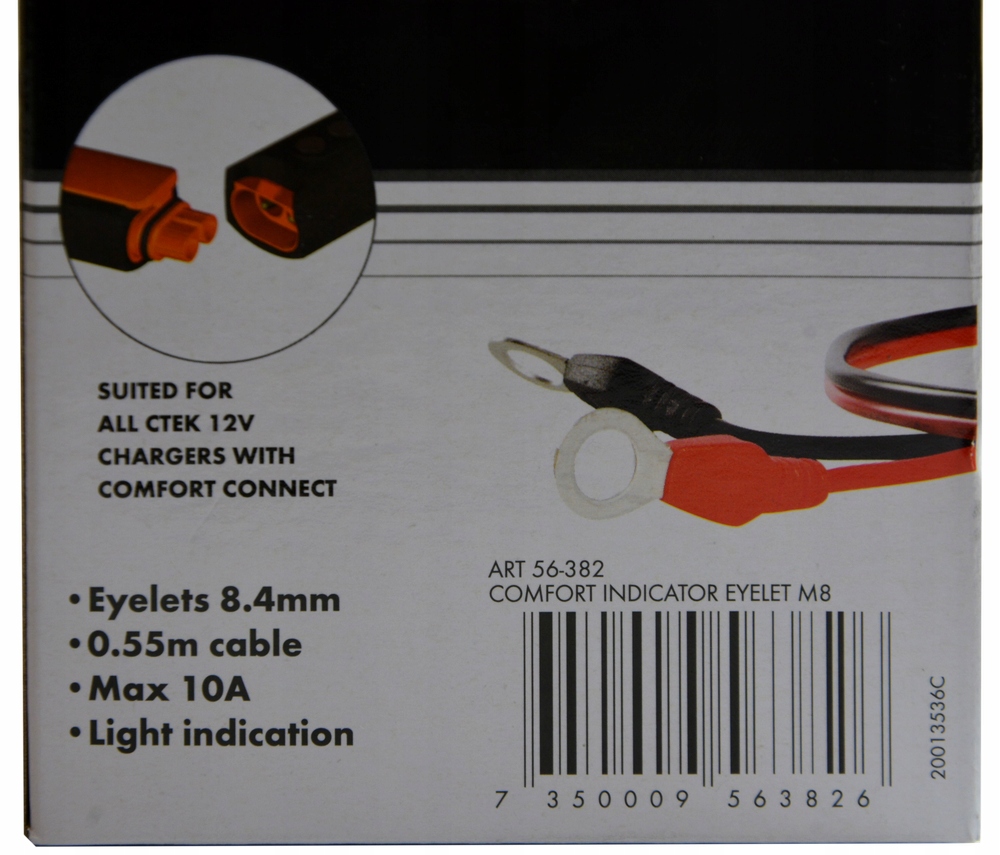 CTEK COMFORT INDICATOR EYELET M8 - светодиодная клемма зарядки аккумулятора, со специальным быстроразъемным разъемом, облегчающим подключение к зарядке. Длина кабеля 0,55 м, макс. зарядный ток 10А, оконцовка с проушиной М8, диодный индикатор.