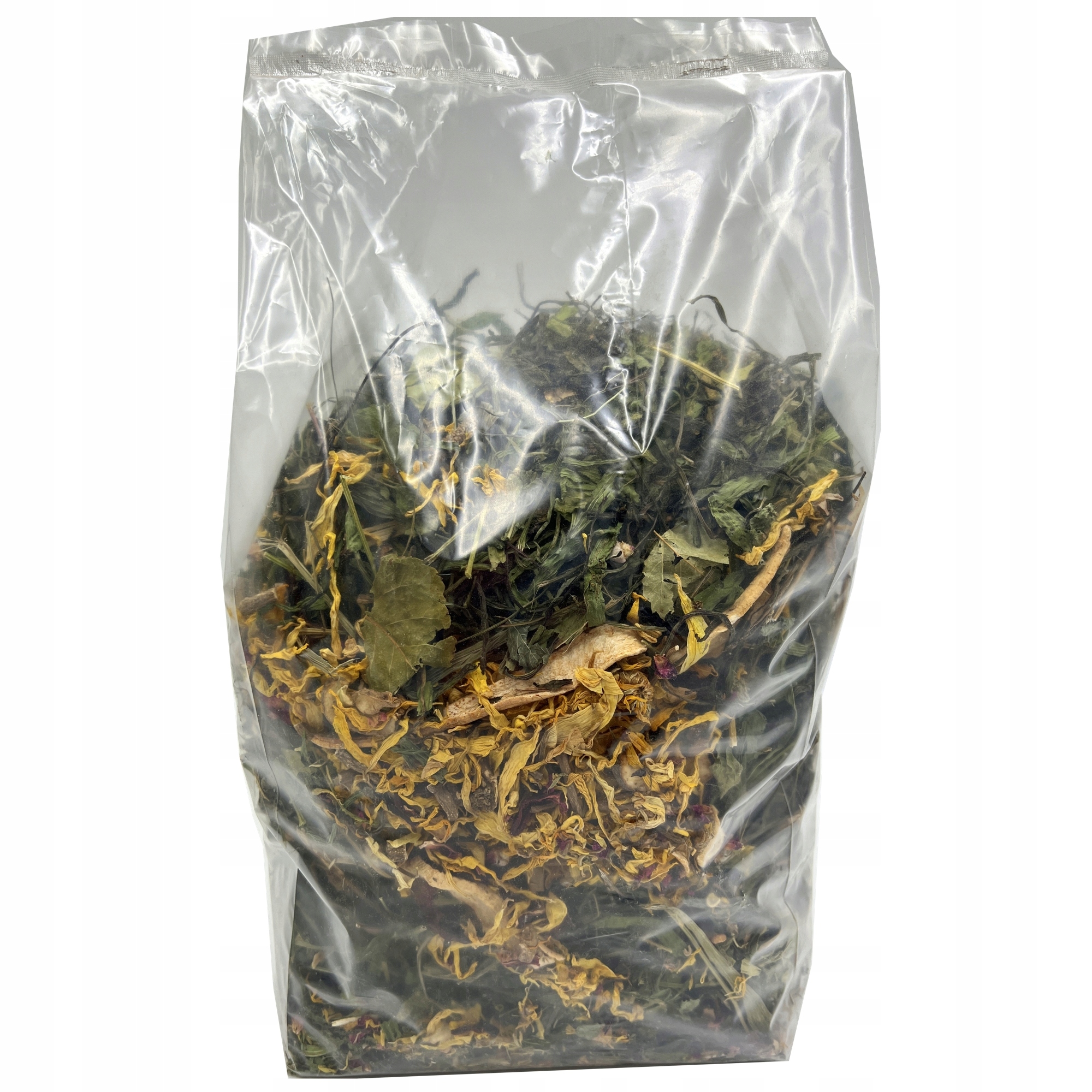 Ингредиенты: лист подорожника, лист одуванчика, стебли мелиссы, трава и корень топинамбура, люцерна, трава тысячелистника. и цветок, эхинацея, трава и цветок василька, веточки и листья березы, лист и стебель крапивы, цветок подсолнечника, цветок бархатцев, цветок гибискуса, цветок розы, корень петрушки, корень одуванчика.