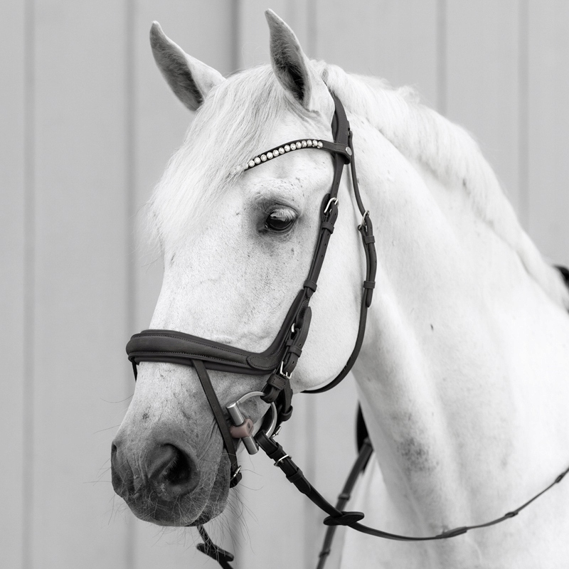 Встроенные нащечные планки придают всему этому элегантный вид, поскольку ограничивают количество полосок по бокам головы. Благодаря системе KavalSH4 уздечку можно использовать и без недоуздок. Что уникально: не видно крепления диагонали - в отличие от обычных уздечек со съемной диагональю.