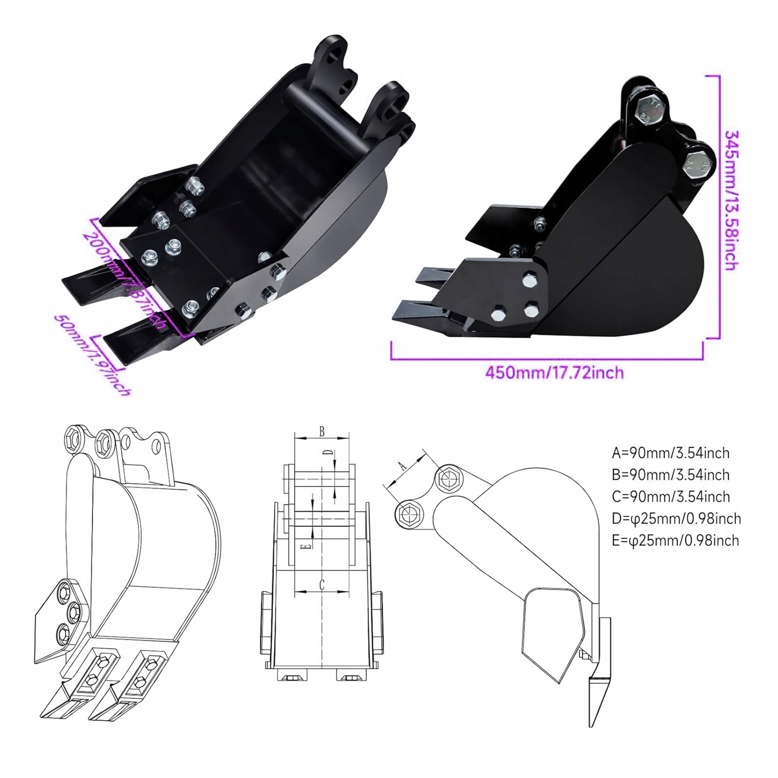 5. Простота установки: это крепление для ковша подходит для различных моделей мини-экскаваторов. Длина пролета составляет 90 мм/3,54 дюйма. Диаметр отверстия для 25 мм/0,98 дюйма. Центральная колесная база составляет 90 мм/3,54 дюйма