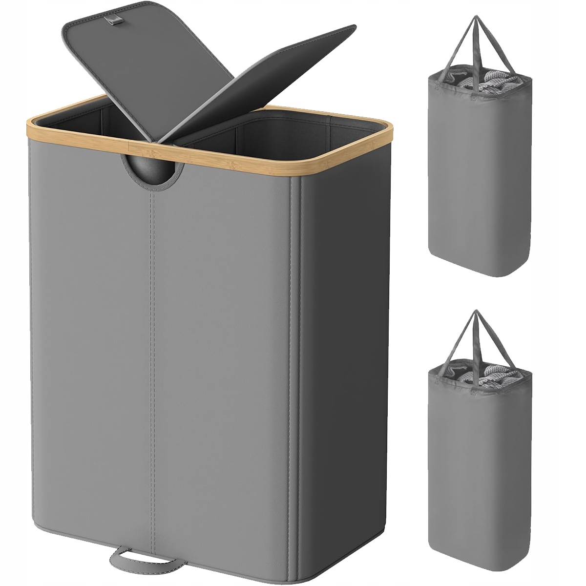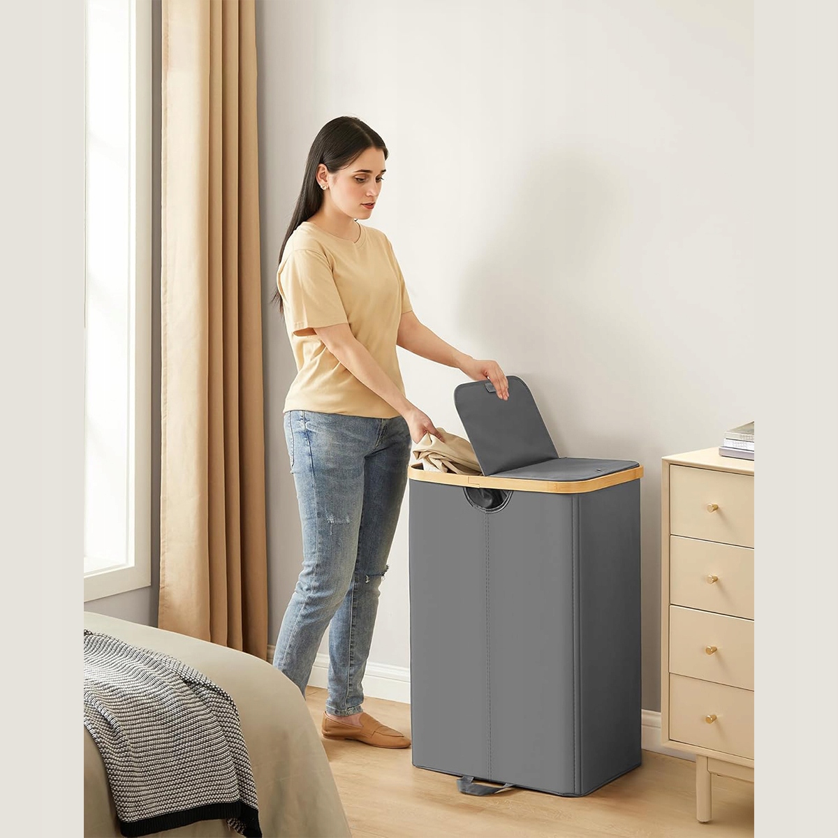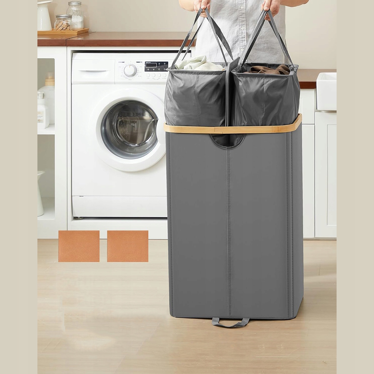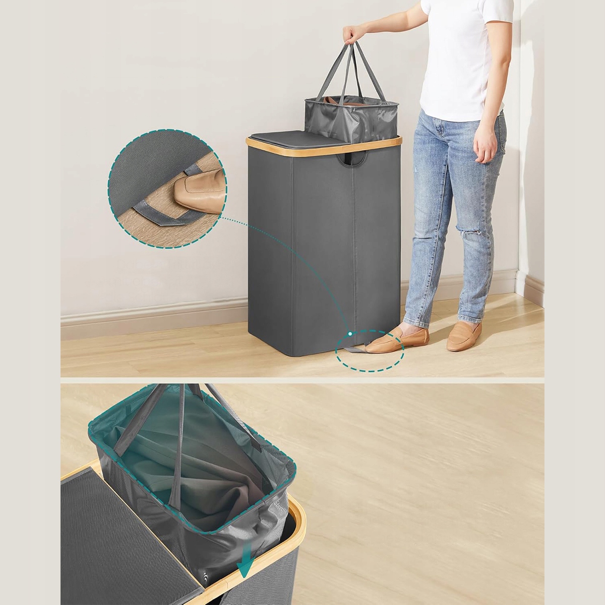 ✅Корзина для белья с 2 отделениями, 150 литров, сортировщик белья с крышкой, корзина для белья, съемные мешки для белья, для прачечной, спальни, гостиной, серый ✅