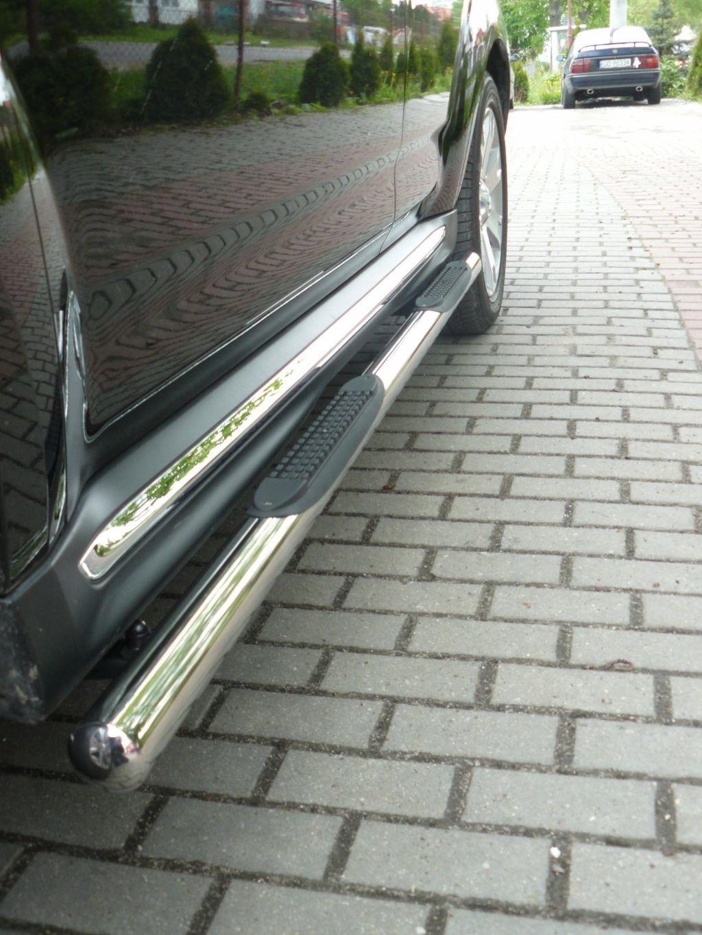 Боковая труба с накладками, прикрученными к заводским отверстиям автомобиля.