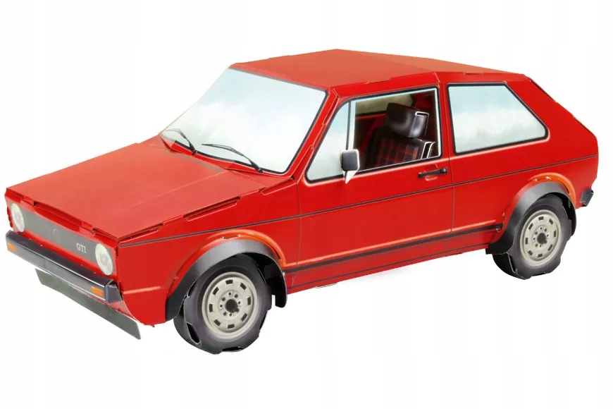 Картон Модель в типичном красном цвете впечатляет красивыми деталями и изысканным интерьером. Как и большая модель 1976 года, готовая модель имеет не только решетку радиатора в красной рамке и черные декоративные полосы по бокам, но и детализированный интерьер с клетчатыми чехлами на сиденьях и рычагом переключения передач Golf. Цветная маркировка на отдельных элементах модели показывает, как детали картона соединяются между собой. Из предварительно нарезанных деталей вы можете создать GTI для своего стола, витрины или полки за 85 шагов. Для всей сборки клей не требуется!