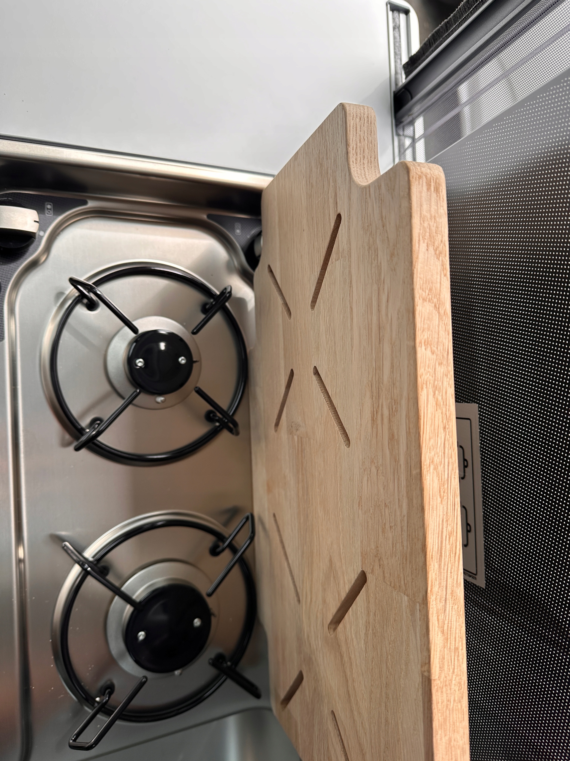 Функциональность и эстетика в одной - рубки, созданная специально для кухни в VW Grand California Camper. Идеально сочетается с рукой горячей, в нем находится элемент заводского оборудования. Это умное решение, которое позволяет вам сэкономить место и всегда иметь доску под рукой.