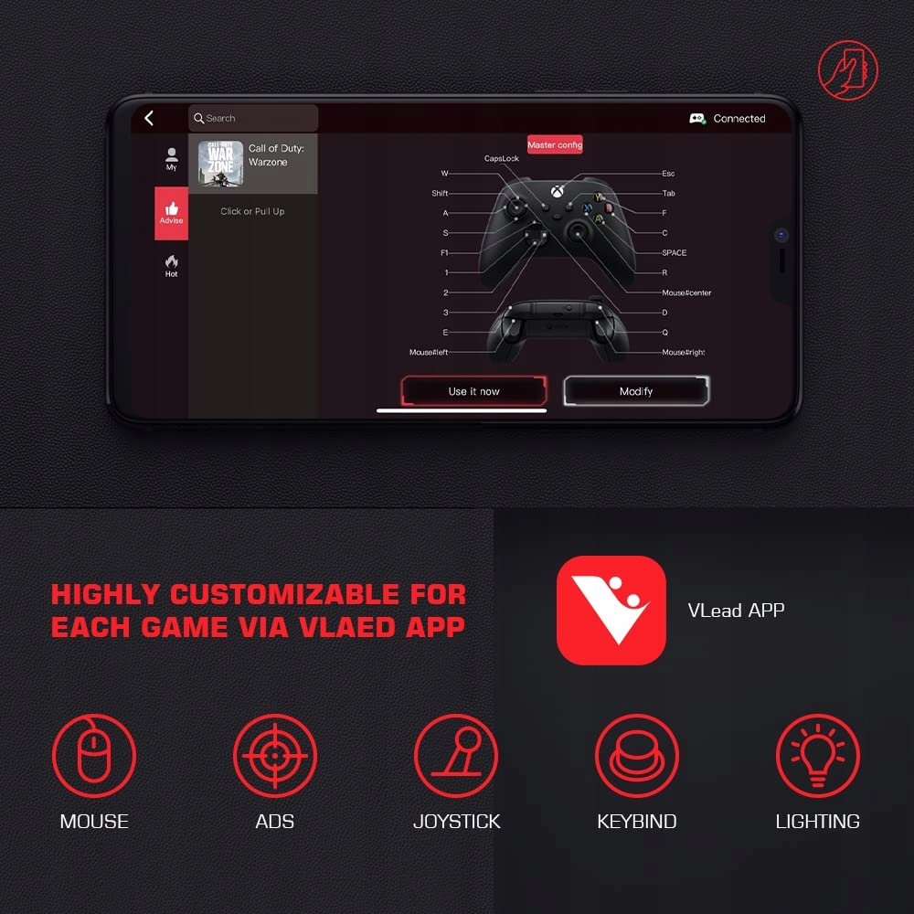 【Технология гибкого перевода】Усовершенствованная технология гибкого переводчика VX обеспечивает функцию дополнения к игре 1:1, которая поддерживает своевременное управление и руководство по клавиатуре и мыши на Xbox/PS/Nintendo Switch. 【Настраиваемые настройки игры в приложении】Переключайте настроенную мышь, камеру, джойстик, горячие клавиши и настройки управления в приложении «Vlead» в соответствии с вашими устройствами.