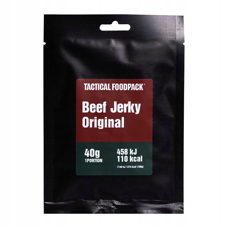 <р> Снек Beef Jerky Original производства эстонской компании TacticalFP в упаковке 40 г. <р> Американский способ приготовления сушеной говядины. Настоящая вяленая говядина, как на Диком Западе. Настоящий и полный вкус, сочный и нежный по текстуре. Идеальное сочетание для всех, кто любит Джерки! Возвращаемся к основам… Tactical Foodpack — лучший сублимированный корм для кемпинга, походов и приключений на природе. <р> Высочайшее качество. Высокое содержание белка, низкое содержание сахара. <р> Ингредиенты: <р> говяжья начинка (68,94%), мед, соевый соус (вода, соя, соль, спиртовой уксус), коричневый сахар, красное вино, яблочный уксус, специи, сливы, ананасовый сок, лук, горчица, чеснок, ароматизатор дыма, соль, сельдерей. <р> Аллергены: <р> соевые бобы, горчица, сельдерей, мед. <р>Пищевая ценность в 100 г в порции 40 г Энергетическая ценность 1146 кДж/274 ккал 458 кДж/110 ккал Толстый 2,1 г 0,8 г В том числе насыщенные жирные кислоты 0,97 г 0,4 г Углеводы 23,3 г 9,3 г Включая сахар 5,7 г 2,3 г Белок 40,5 г 16,2 г Соль 2,7 г 1,1 г
