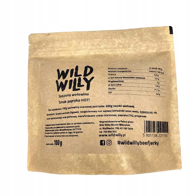 <р> Первый этап производства – отбор соответствующего мяса. Wild WillyДля этой цели использует говядину только от проверенных польских поставщиков, которые заботятся о своем скоте. Выбор ветчины Лигава самого высокого качества – это первый шаг к вяленой говядине. Следующий шаг — правильно нарезать мясо на тонкие ломтики, которые затем выдерживаются в течение 24 часов в уникальном маринаде. Как и в случае с базовой версией, он состоит из трёх видов перца, но в версии HOT главную роль играет перец хабанеро. Утонченность вкуса достигается путем сушки маринованной говядины над дымом ольхи. <р>Почему Дикий Вилли?