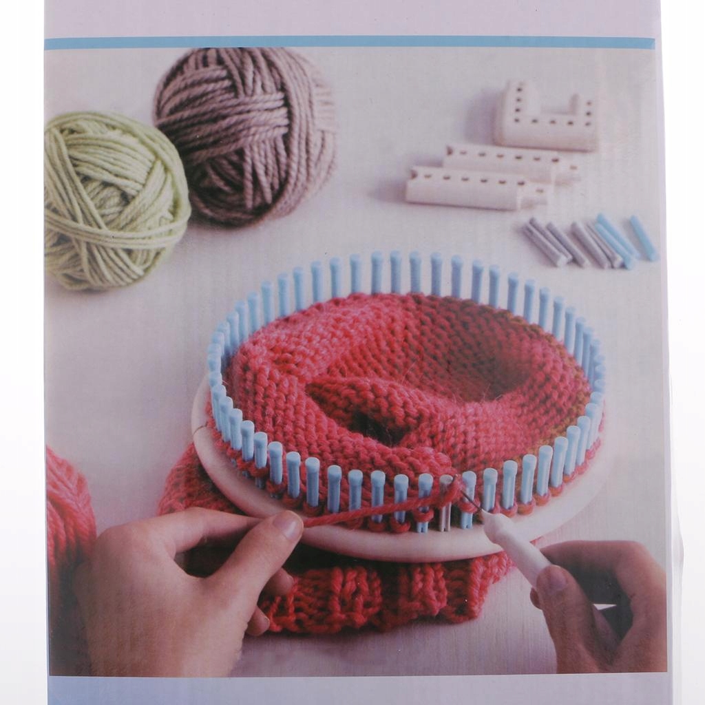 В комплект также входят 206 маленьких колышков, 104 больших колышка, инструмент для вязания, инструмент для плетения, крючок для вязания, пряжа и инструкции