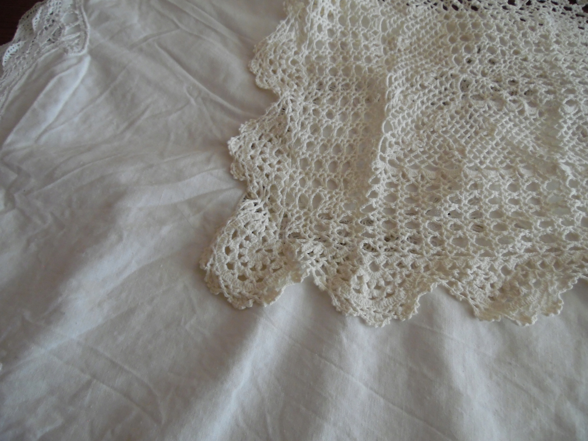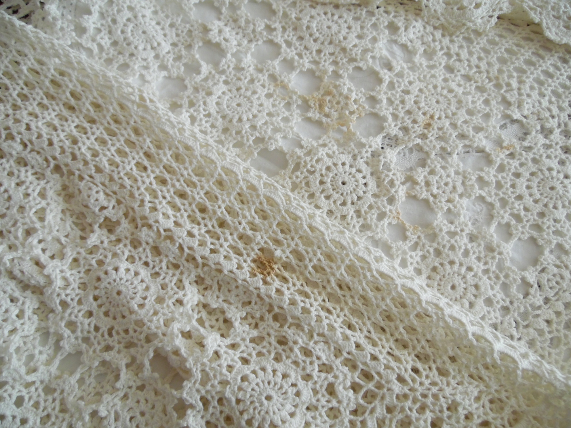 Кружевная скатерть связана вручную из хлопковых ниток крючком, светло-кремового цвета, с пятнами. Немытый, чтобы освежиться. Размер: ок. 130х190 см.