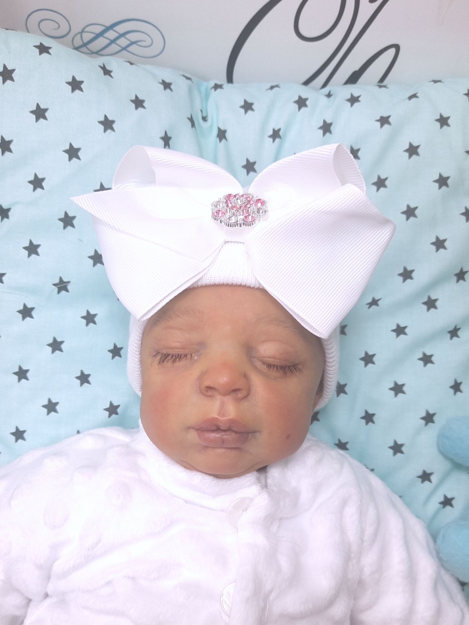 В'язана шапка для дівчинки великий бант стрази хрестини біла 0-6